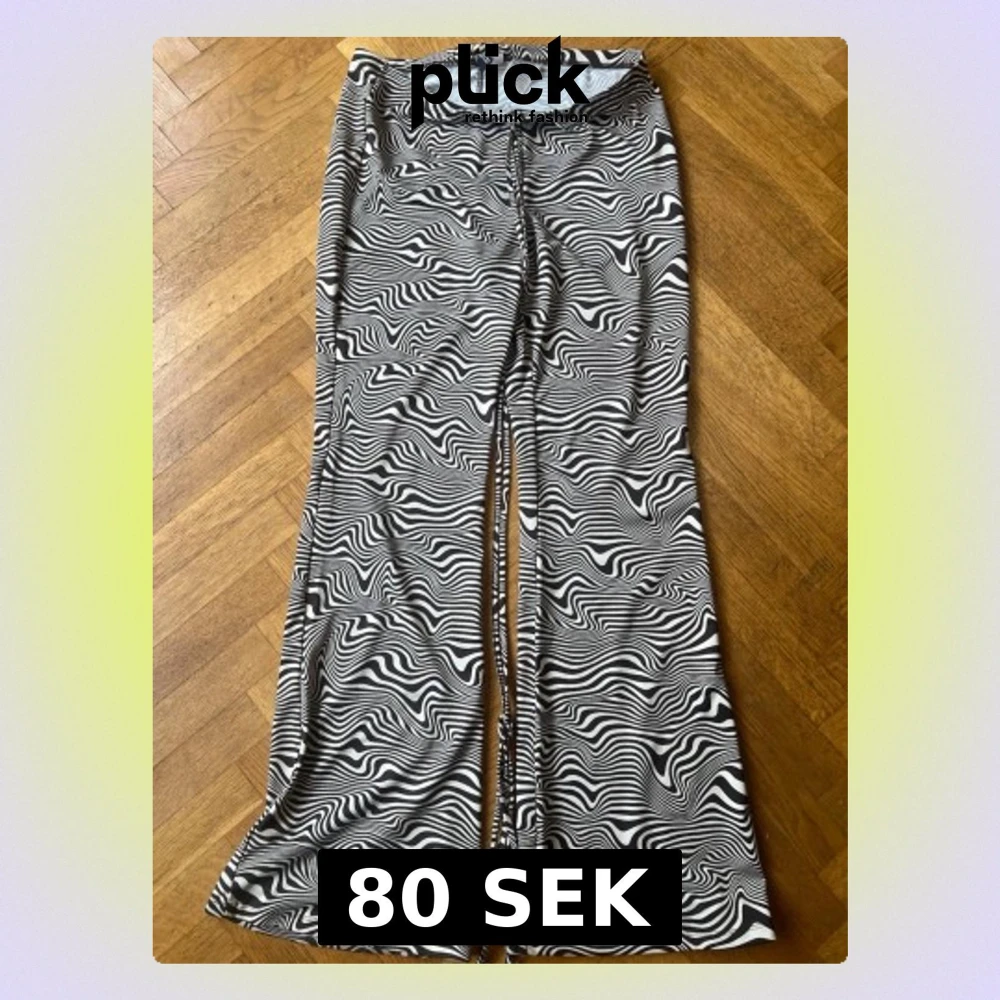 Säljer ett par svartvita leggings med vågigt, psykedeliskt mönster och utsvängda ben. De har dragsko i midjan och är gjorda i ett stretchigt, mjukt material som sitter skönt på kroppen. Perfekta för dig som gillar statement-plagg och coola mönster.