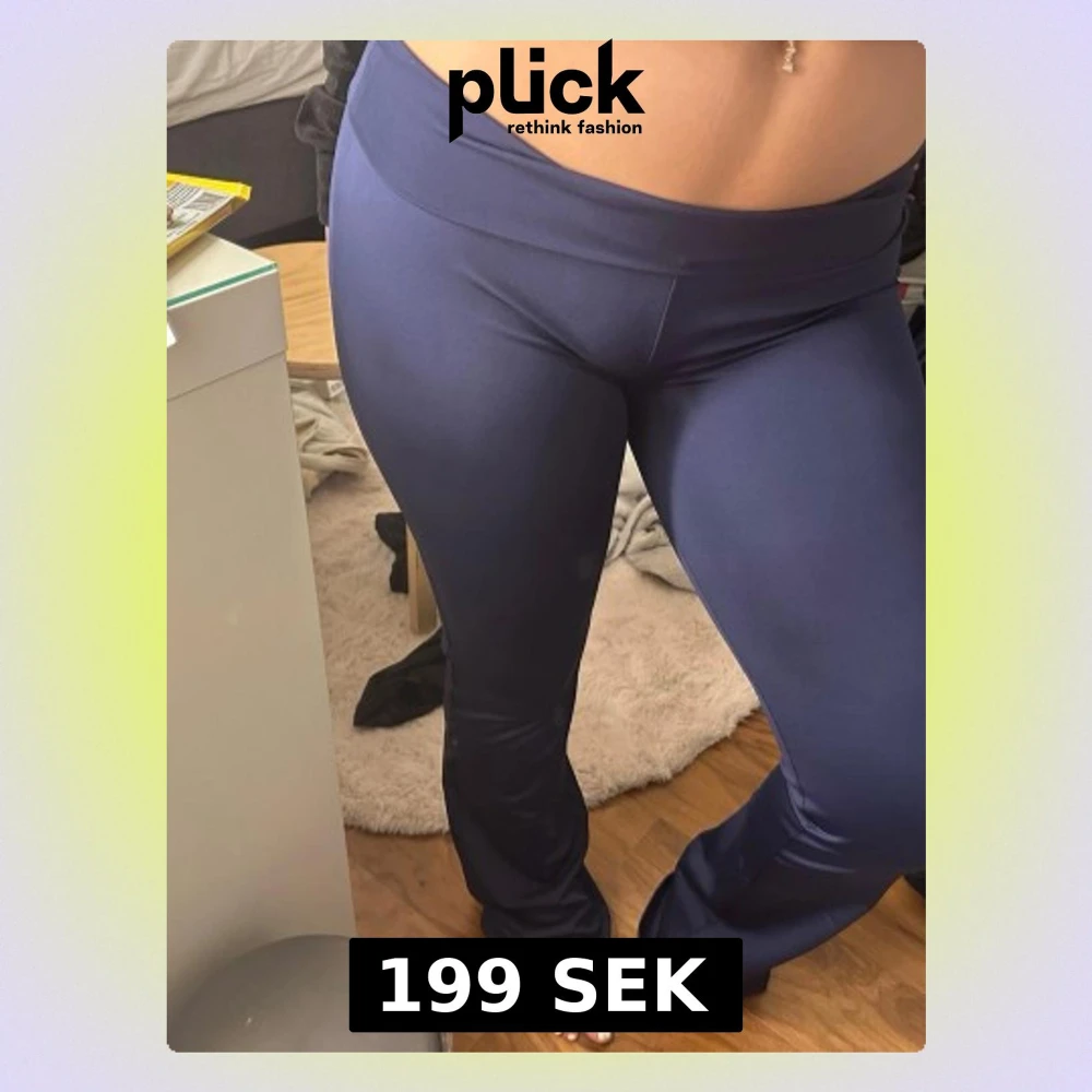 Säljer ett par mörkblå leggings med utsvängda ben och hög midja. De är tillverkade i ett stretchigt, glansigt material som sitter tajt över höfterna och låren. Använd 1-2ggr