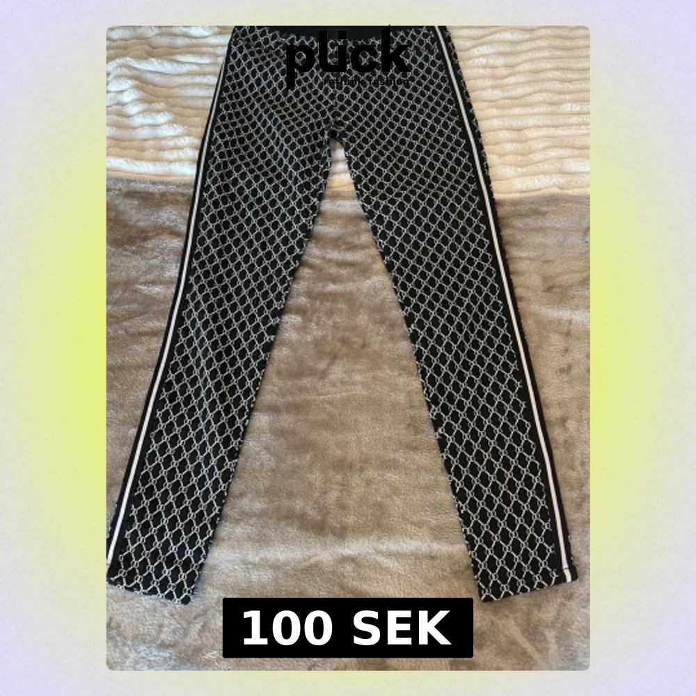 Snygga svarta leggings med vitt kedjemönster över hela byxan och vita ränder längs sidorna. Stretchigt material som sitter tight och bekvämt. Perfekta för dig som vill ha en trendig och sportig look.