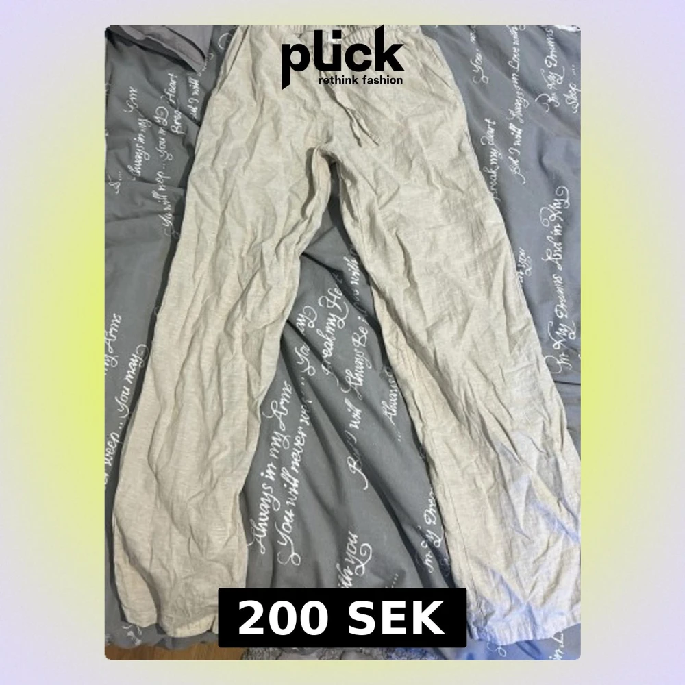 Säljer ett par beige linnebyxor med rak passform och elastisk midja med dragsko. Byxorna är tillverkade i ett tunt och luftigt linnematerial som är perfekt för varma dagar. De har en enkel design utan synliga fickor eller detaljer.