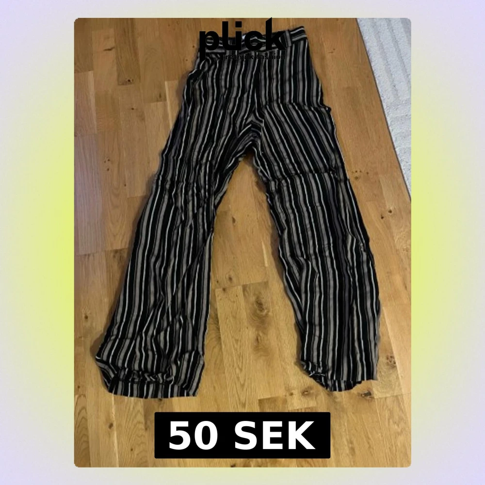 Säljer ett par svarta kostymbyxor med vita och beige vertikala ränder. Byxorna har hög midja och vida ben för en avslappnad och trendig look. Perfekta för dig som gillar att sticka ut med mönster och vill ha en bekväm passform.