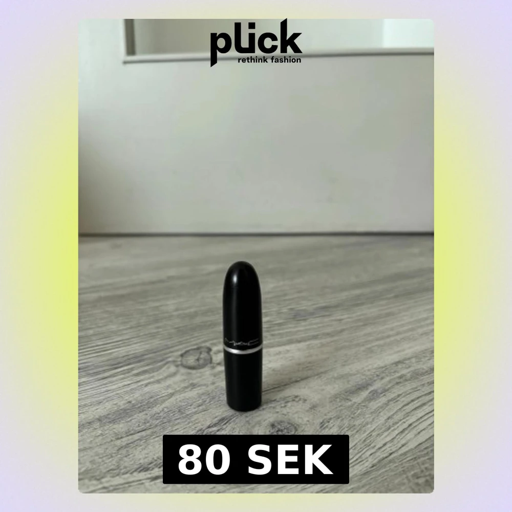 MAC läppstift i klassisk svart hylsa med silverdetaljer. Färgen är en varm nude med inslag av rosa-brunt, perfekt för en naturlig look. Hylsan har den ikoniska MAC-loggan och är tillverkad i plast med metallinslag.