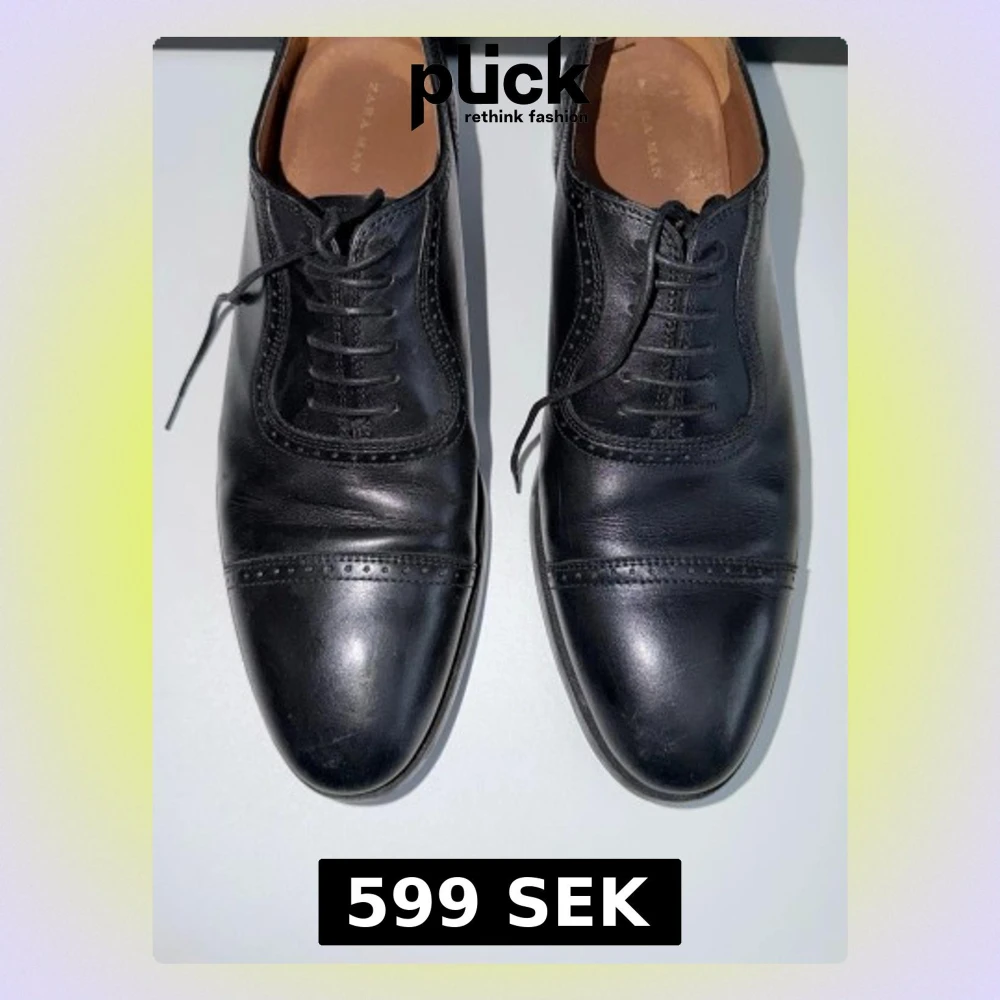 Säljer ett par klassiska svarta läderskor från Zara Man. Skorna har rundad tå, snörning och diskreta broguedetaljer vid tåkappan. Insidan är fodrad i brunt och de har en stilren, tidlös design som passar till många olika looks.