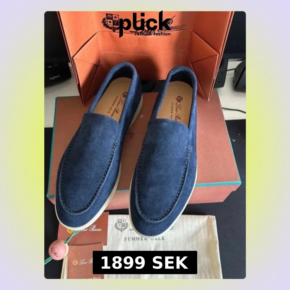 Snygga loafers från Loro Piana i blå mocka med vit sula. Skorna är endast använda ett fåtal gånger och säljes på grund av att dom är för stora för mig. Modellen heter Summer Walk och har en stilren, klassisk design utan snörning. Skorna har diskreta sömmar och en mjuk innersula med logotyp. Perfekta för en avslappnad men ändå elegant look.