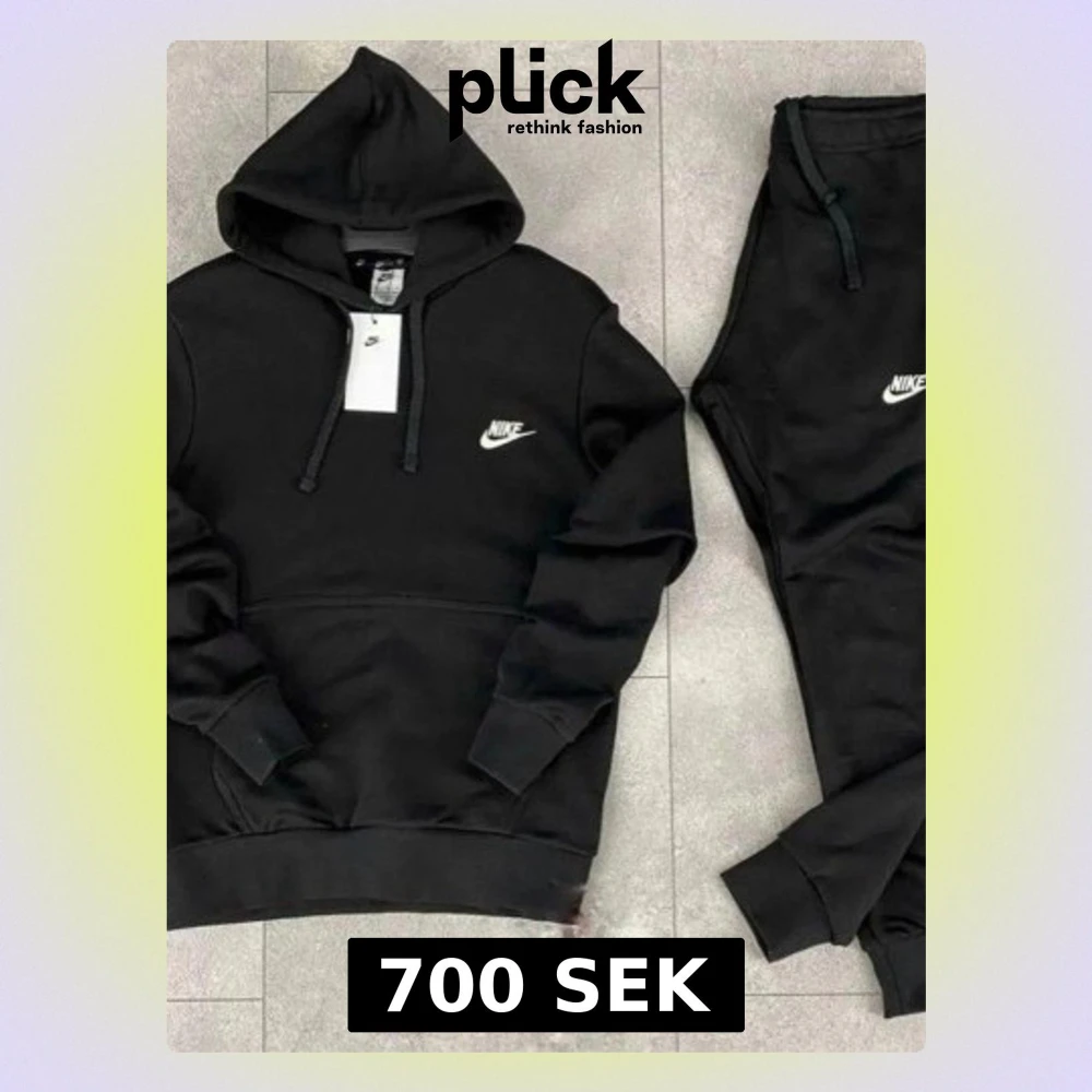 Snyggt svart loungewear set från Nike med hoodie och matchande byxor. Hoodien har dragsko i huvan, magficka och Nike-logga på bröstet. Byxorna har resår i midjan och Nike-logga på benet. Perfekt för chill dagar hemma.