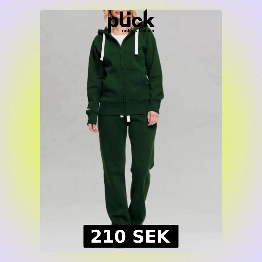 Mysig mörkgrön mjukisdress med dragkedja och huva. Setet består av en hoodie med vita snören och matchande byxor med resår och dragsko i midjan. Perfekt för chill hemma eller när du vill vara bekväm. Tillverkad i mjukt bomullsmaterial.