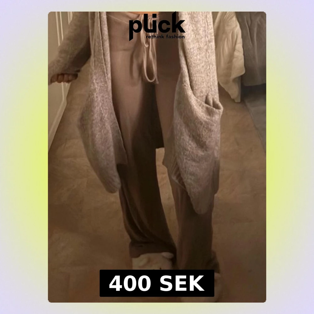 Mysigt loungewear-set i beige med vida byxor och matchande kofta med stora fickor. Byxorna har dragsko i midjan och koftan är stickad i mjukt material. Perfekt för chill hemma. Säljs utan tofflor.