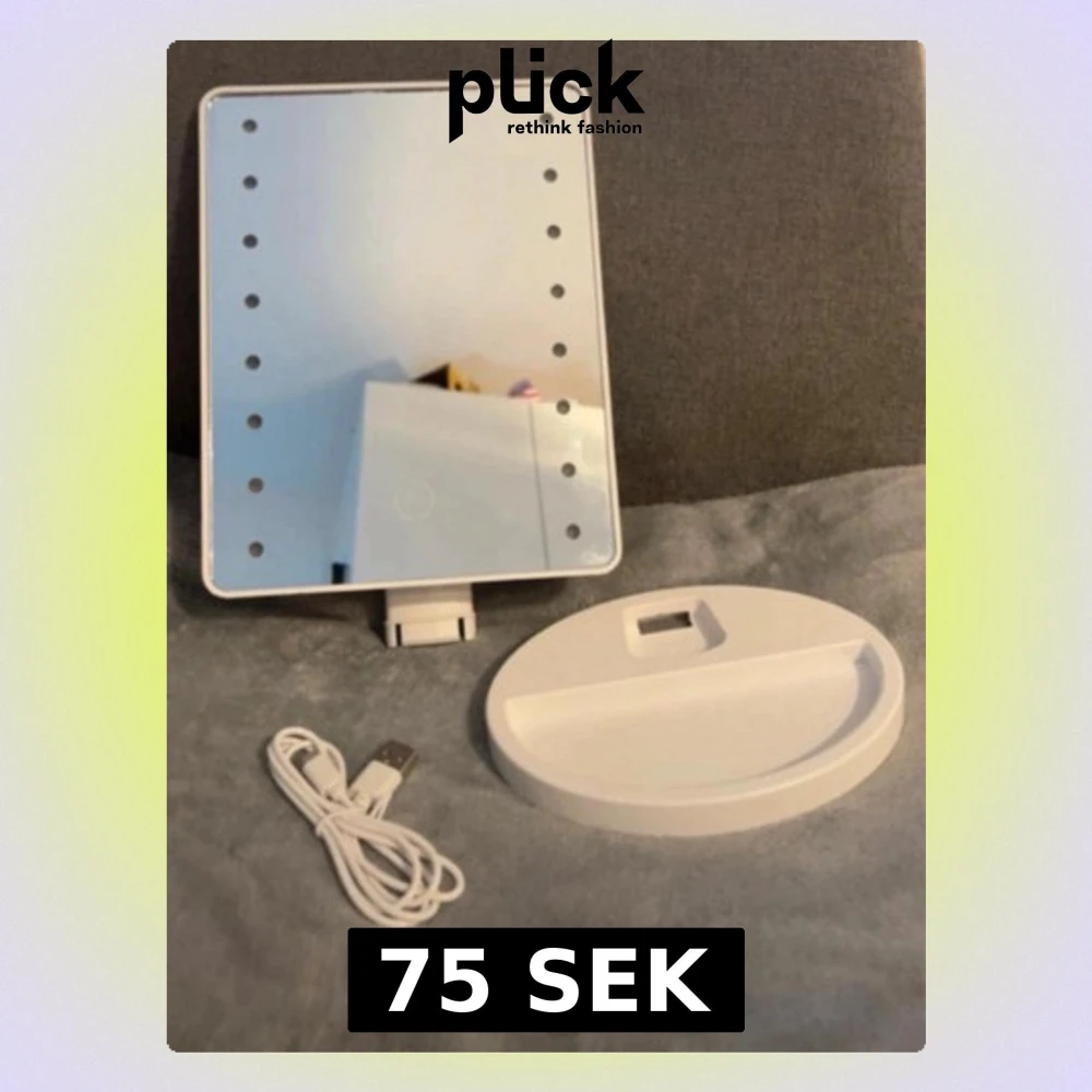 Snygg sminkspegel i vit plast med rektangulär form och inbyggd LED-belysning runt spegeln. Touch-knapp på framsidan för att justera ljuset. Spegeln kommer med en avtagbar fot och USB-kabel för laddning. Perfekt för smink och styling.