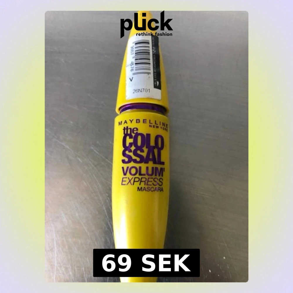 Gul mascara från Maybelline med lila text, Colossal Volum' Express. Tuben har en avlång, rundad form och är tillverkad i plast. Perfekt för dig som vill ha volym till fransarna och en färgstark förpackning i sminkväskan.