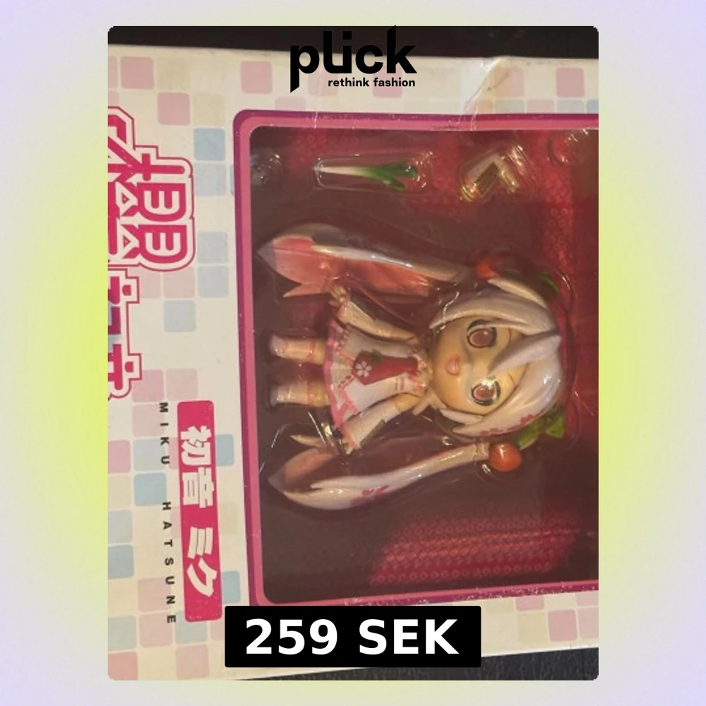 Supergullig Sakura Miku Hatsune figur i rosa och vitt med körsbärsdetaljer i håret. Perfekt för cosplay eller som samlarpryl. Kommer i originalförpackning och har utbytbara tillbehör. Material: plast.