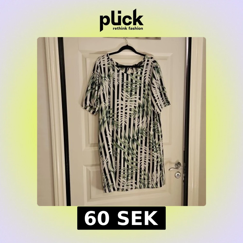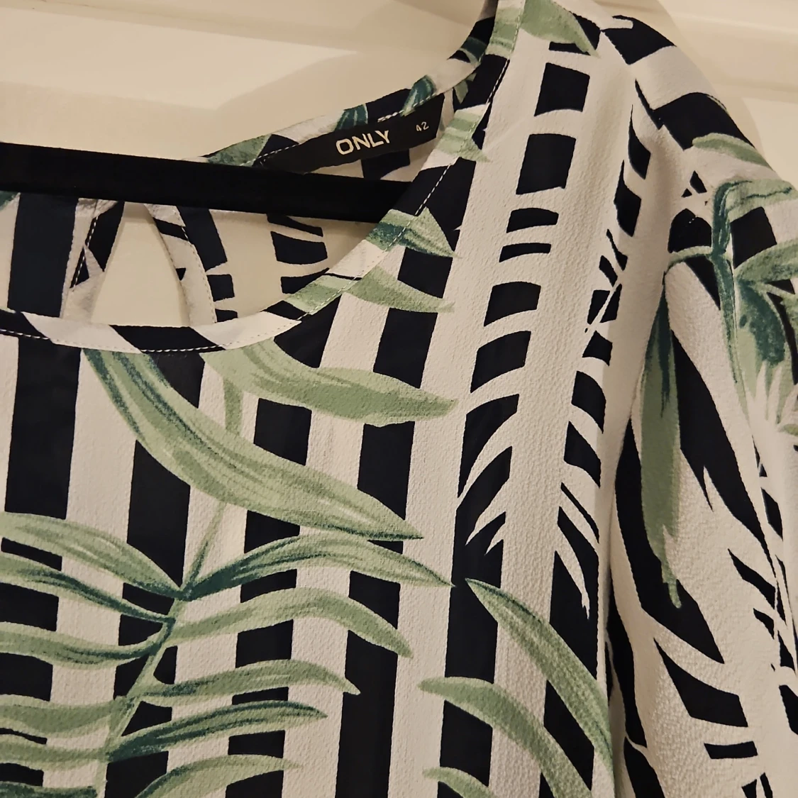 Snygg kortklänning från ONLY med svartvita ränder och grönt palmbladsmönster. Klänningen har rund halsringning och korta ärmar, perfekt för dig som gillar grafiska prints och tropiska vibbar. Materialet känns lätt och luftigt, vilket gör den skön att bära under varma dagar.