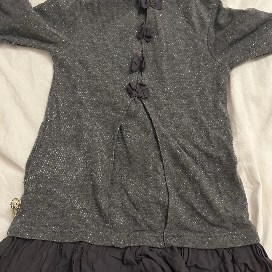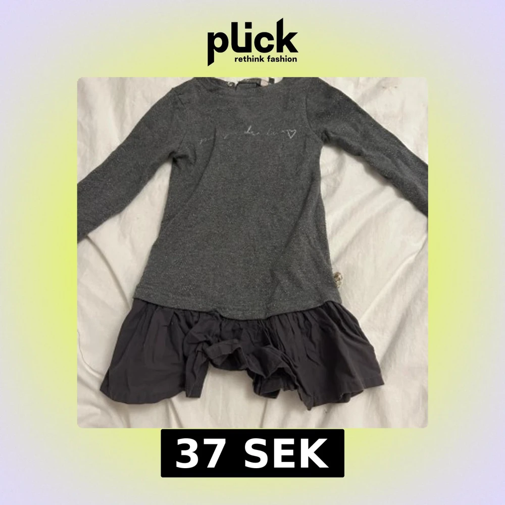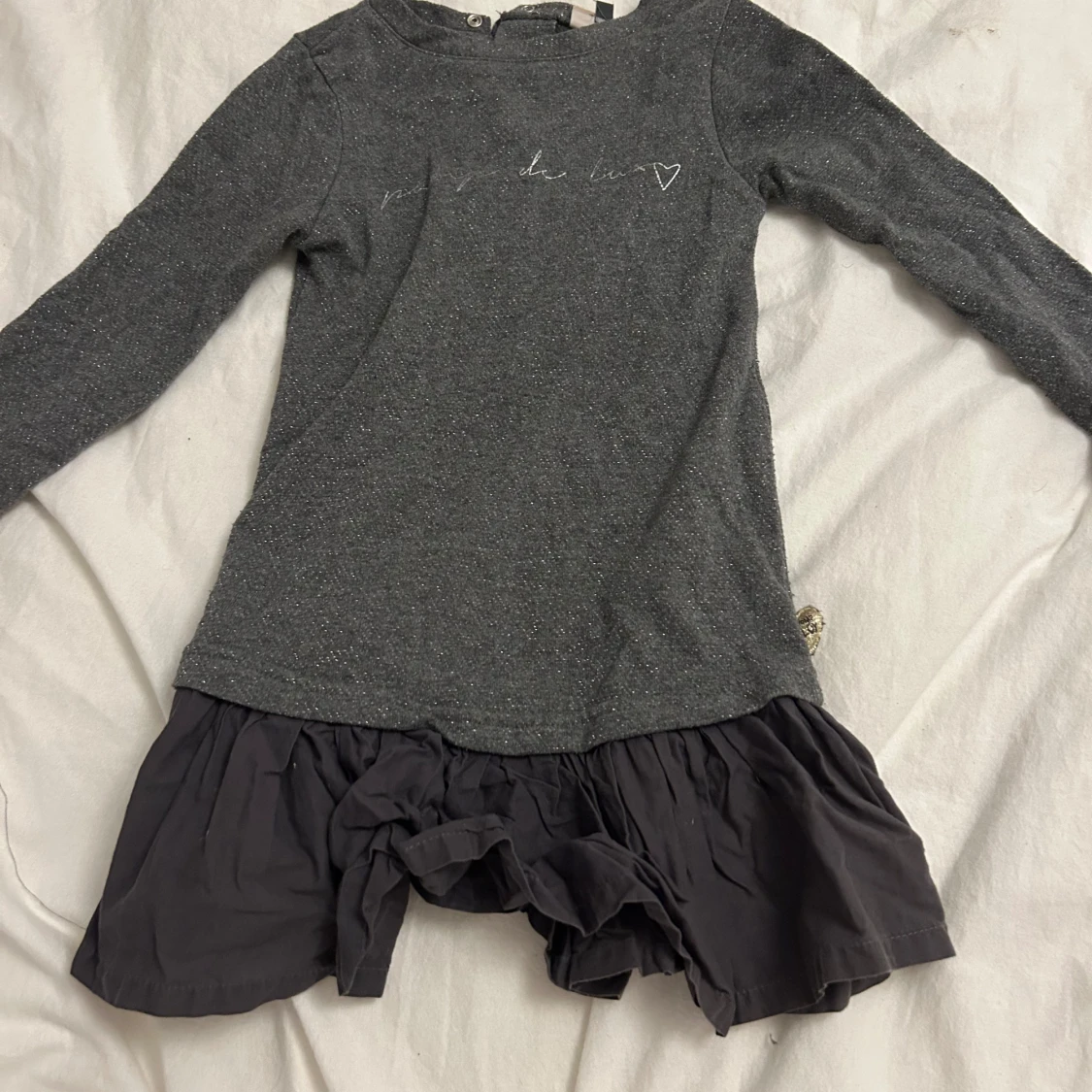 Söt glittrig grå klänning från Pomp de Lux med långa ärmar och volangdetaljer. Klänningen har en dekorativ knytning på baksidan och en mjuk, rynkad kjol, även en text på framsidan. Perfekt för speciella tillfällen! Den kommer tvättas och strykas innan den skickas! ⭐️