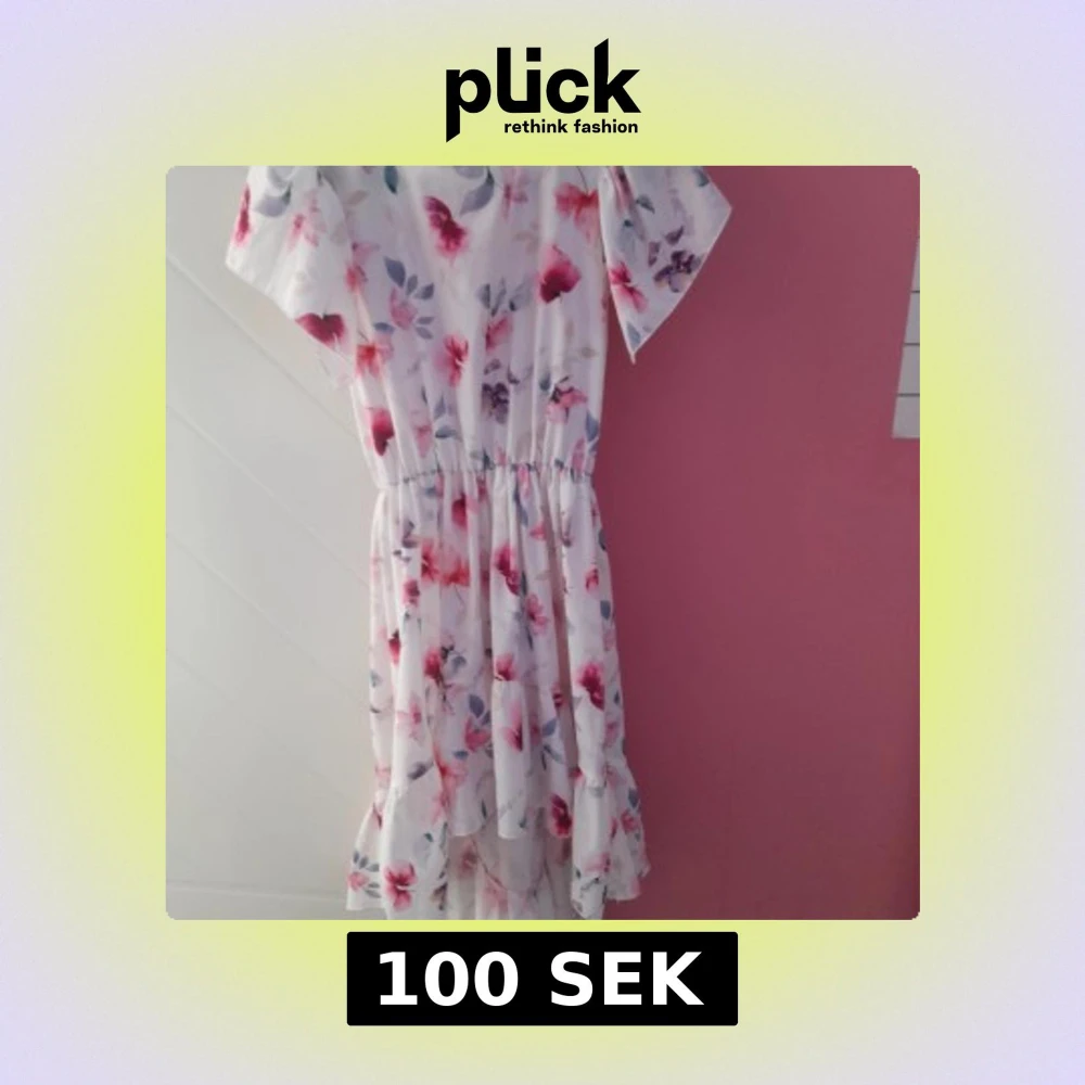 Säljer en söt vit klänning med blommigt mönster i rosa och lila toner. Klänningen har korta ärmar, resår i midjan och volang nertill. Perfekt för sommarens alla tillfällen!
