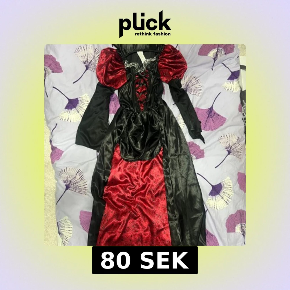 Säljer en lång vampyrklänning i svart och rött med puffiga axlar, snörning framtill och coolt spindelnätsmönster på kjolen. Klänningen har långa ärmar och medföljer ett halsband. Perfekt för Halloween eller temafest! Storlek 134/140 använd 1 gång