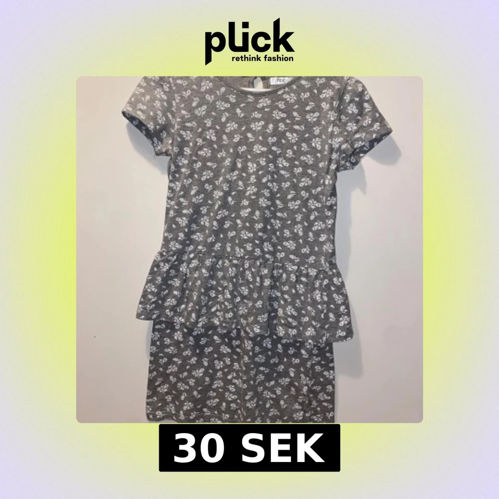 Supersöt grå kortklänning från bpc med vitt blommönster, volang i midjan och knapp i nacken. Mjuk och skön bomullskänsla, perfekt för dig som gillar en chill och söt stil.