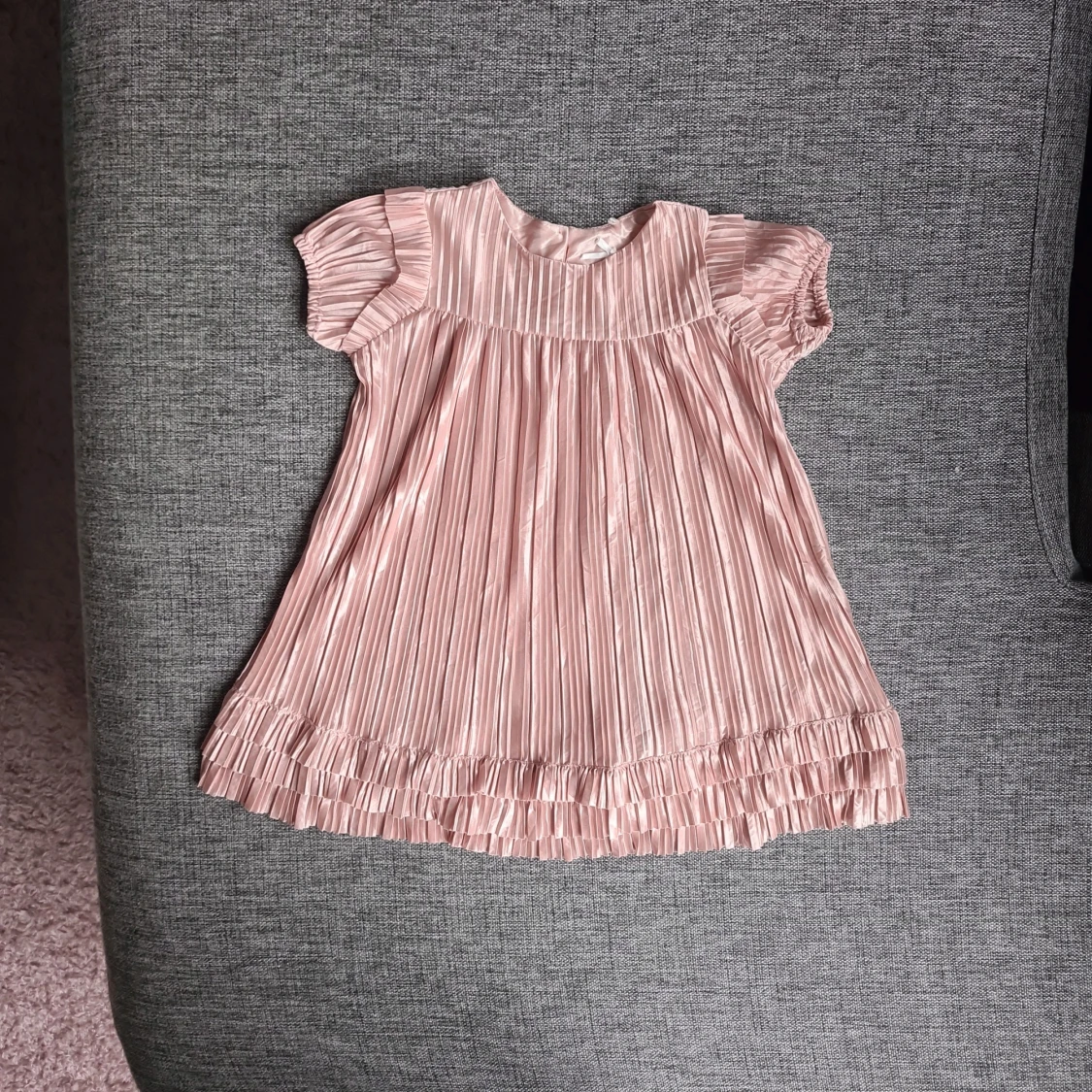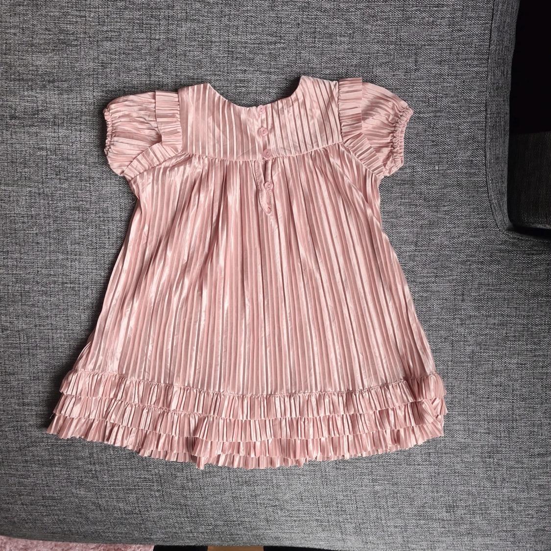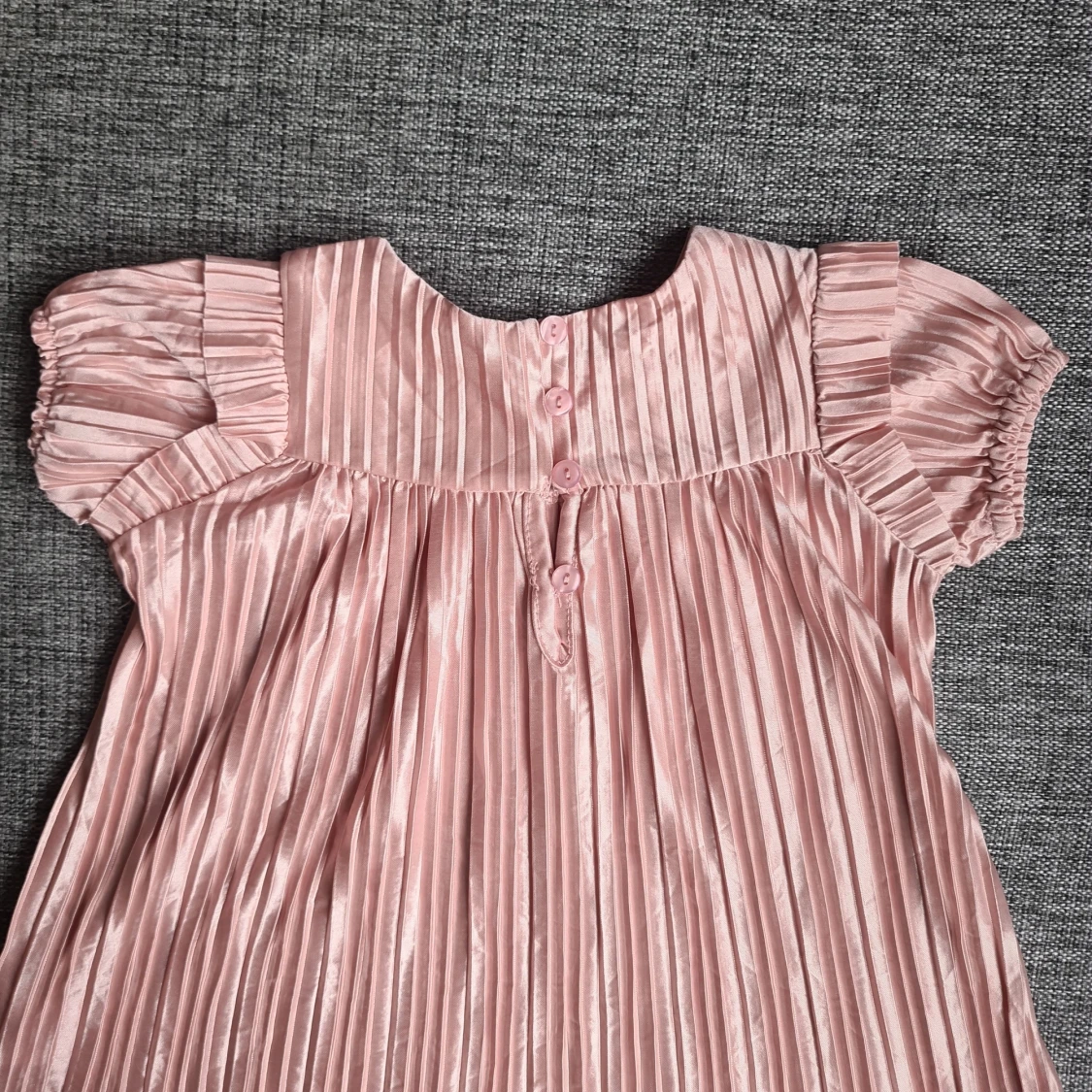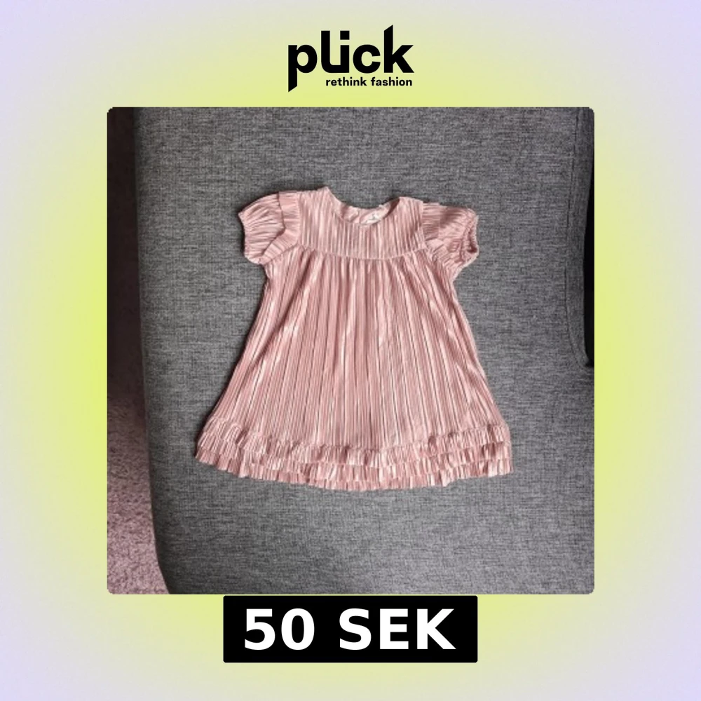 Supersöt ljusrosa plisserad klänning från KIWI med korta volangärmar och knappar i ryggen. Klänningen har glansigt tyg, rund hals och fina volangdetaljer längst ner. Perfekt för dig som gillar gulliga och trendiga plagg!
