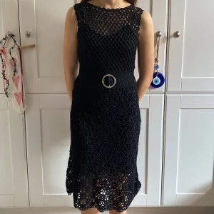 Snygg svart klänning från Karen Millen med ett unikt virkat mönster. Klänningen har en rund ringdetalj i midjan och är ärmlös med en elegant v-ringad rygg. Storlek xs/s