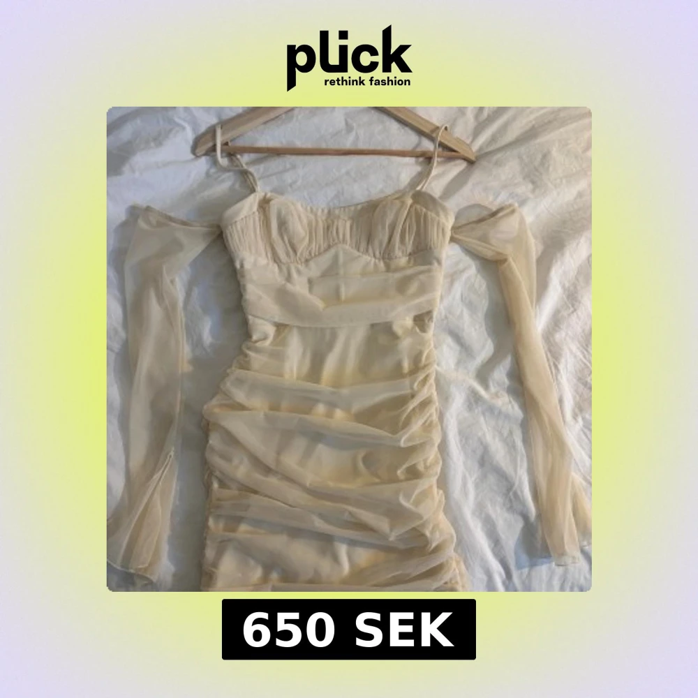 Säljer en champagnefärgad kortklänning med omlottdetaljer och transparenta meshärmar. Klänningen har smala axelband, offshoulder-ärmar och rynkade partier längs hela klänningen för en snygg siluett. Jag har haft den på mig på min bal bara en gång, annars är den ny💓Perfekt för dig som gillar trendiga och romantiska plagg.