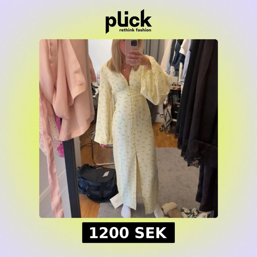 Superfin ljusgul långklänning med små blommor, v-ringad och med knappar framtill. Klänningen har långa, puffiga ärmar och en slits framtill. Endast använd 1 gång’
