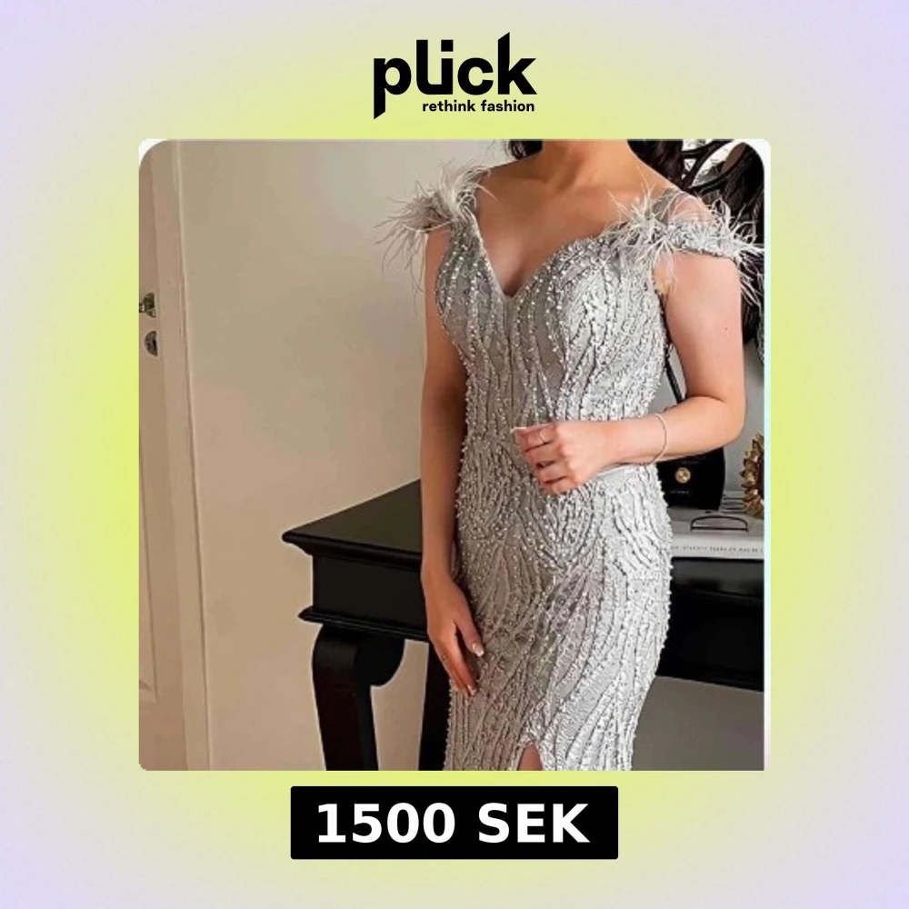 Magisk långklänning i silver med glittriga paljetter och pärlor, v-ringad och med fjäderdetaljer på axlarna. Klänningen har en snygg slits framtill och figurnära passform, perfekt för bal eller fest. Materialet är glansigt och skimrande, vilket ger en lyxig känsla. Den är använd en gång!