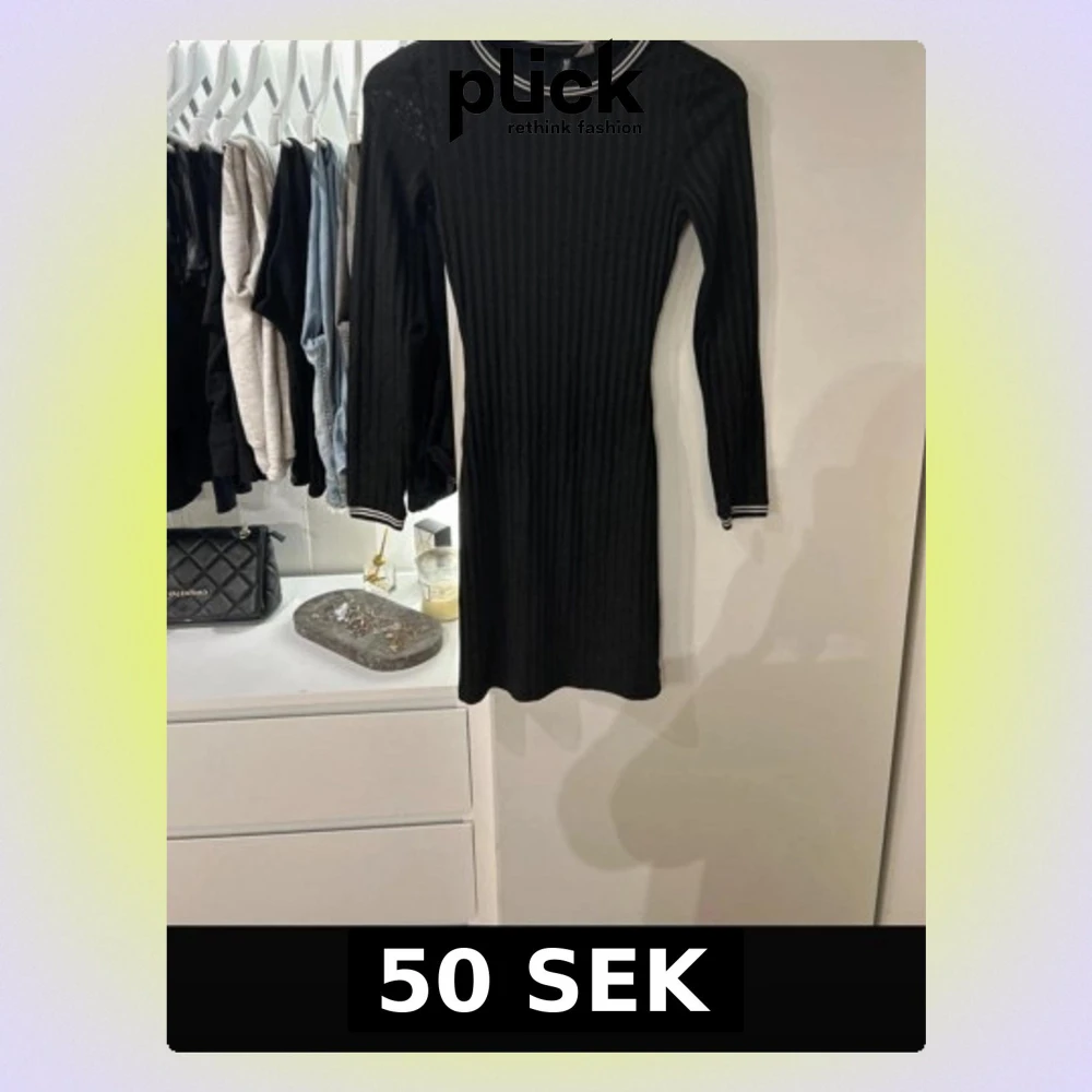 Säljer en svart ribbad kortklänning från H&M Divided i storlek 34. Klänningen har lång ärm, rund halsringning med vit randig detalj och samma rand på ärmsluten. Sitter tight och har en sportig vibe.