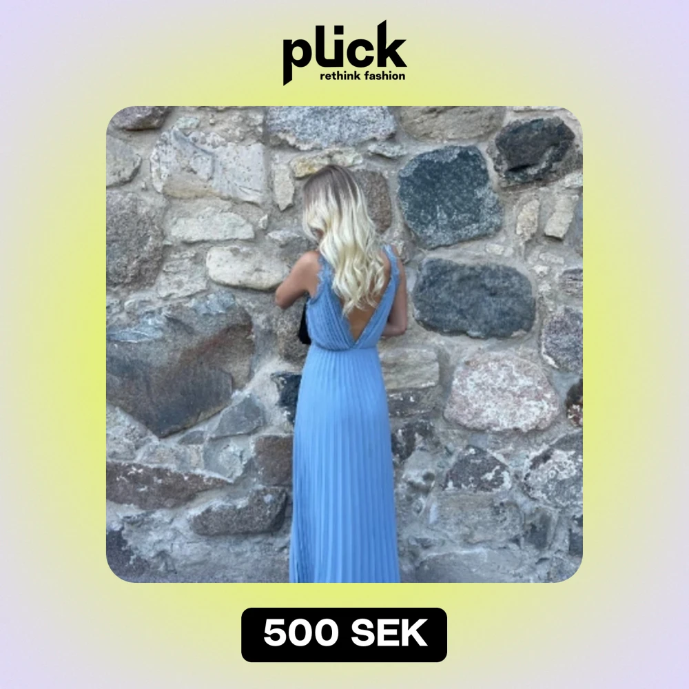 En fin ljusblå balklänning i storlek 34, använd en kväll. Går ner nästan ner till fötterna på mig som är 175. Är en liten söm nertill som ”fnasat” upp sig lite men går att fixa med nått stygn. Sen en liten fläck som va där innan jag använt den.