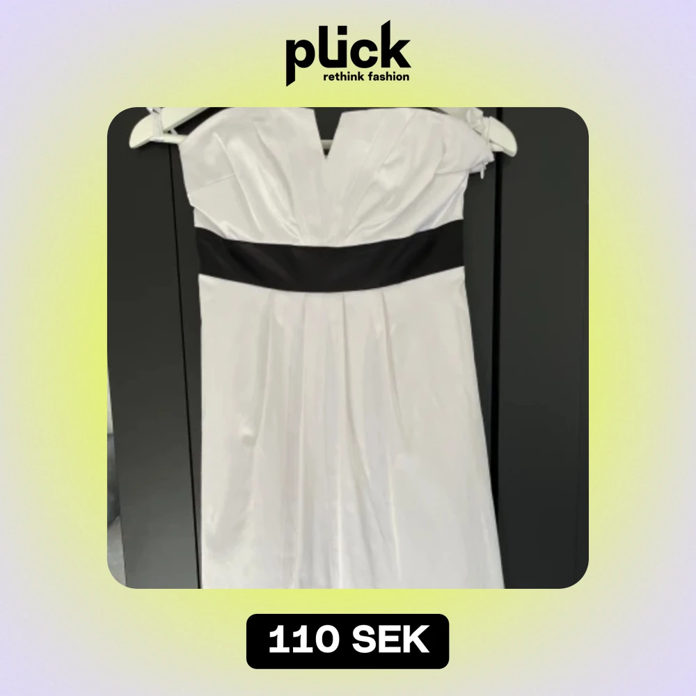 Kort vit klänning med en svart rosett i ryggen. Inga axelband. Bra skick. Storlek 34.