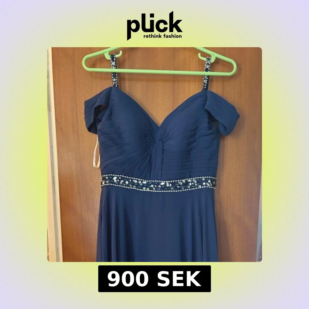 Marinblå långklänning från JJ's House med axelbandsdetaljer och offshoulder-ärmar. Klänningen har v-ringning, plisserad överdel och glittrande pärl- och stenutsmyckning i midjan och på axelbanden. Snörning i ryggen för perfekt passform. Perfekt för bal eller fest. Har används några timmar, inga slitage!!! Först till kvarn! Slängs om den inte blir såld om 4 veckor!