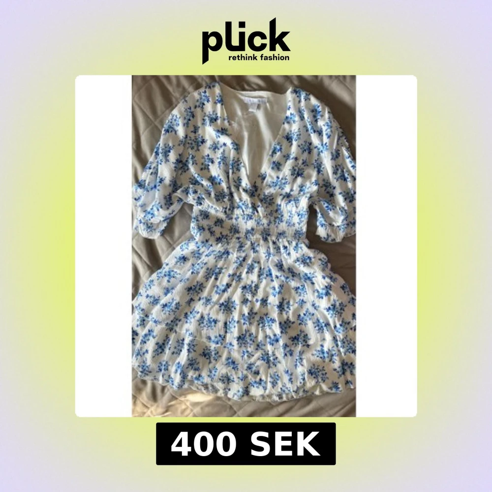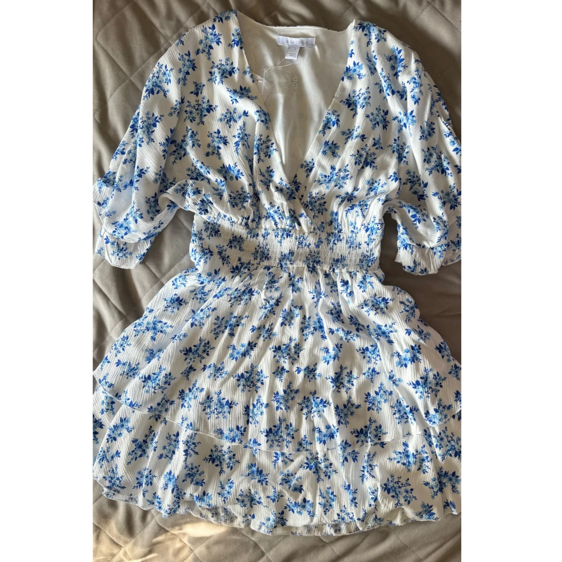 Supersöt kortklänning med blått blommönster på vit botten. Djup v-ringning och resår i midjan för en smickrande passform. Klänningen har korta ärmar och är perfekt för varma dagar. Perfekt till midsommar🥰