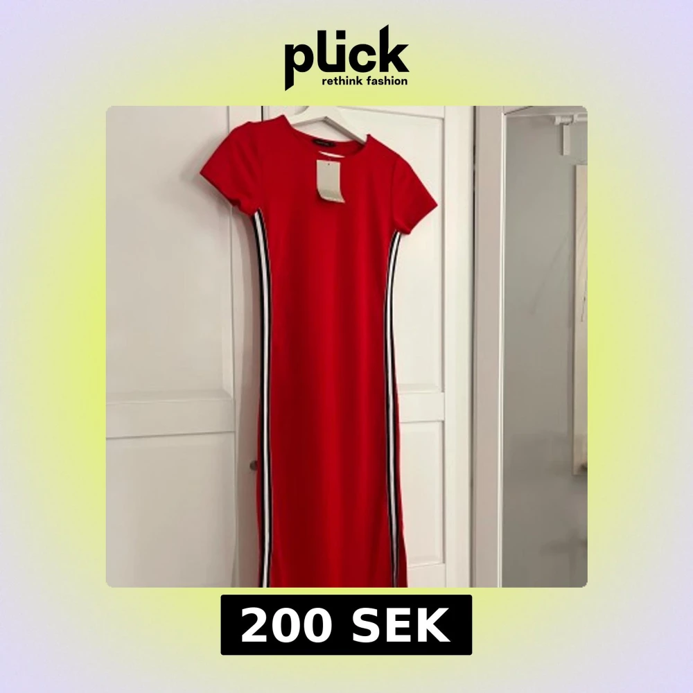 Säljer en röd kortärmad klänning från DeFacto med svarta och vita ränder längs sidorna. Klänningen har rund halsringning och en figurnära passform. Perfekt för dig som gillar en enkel men snygg stil.
