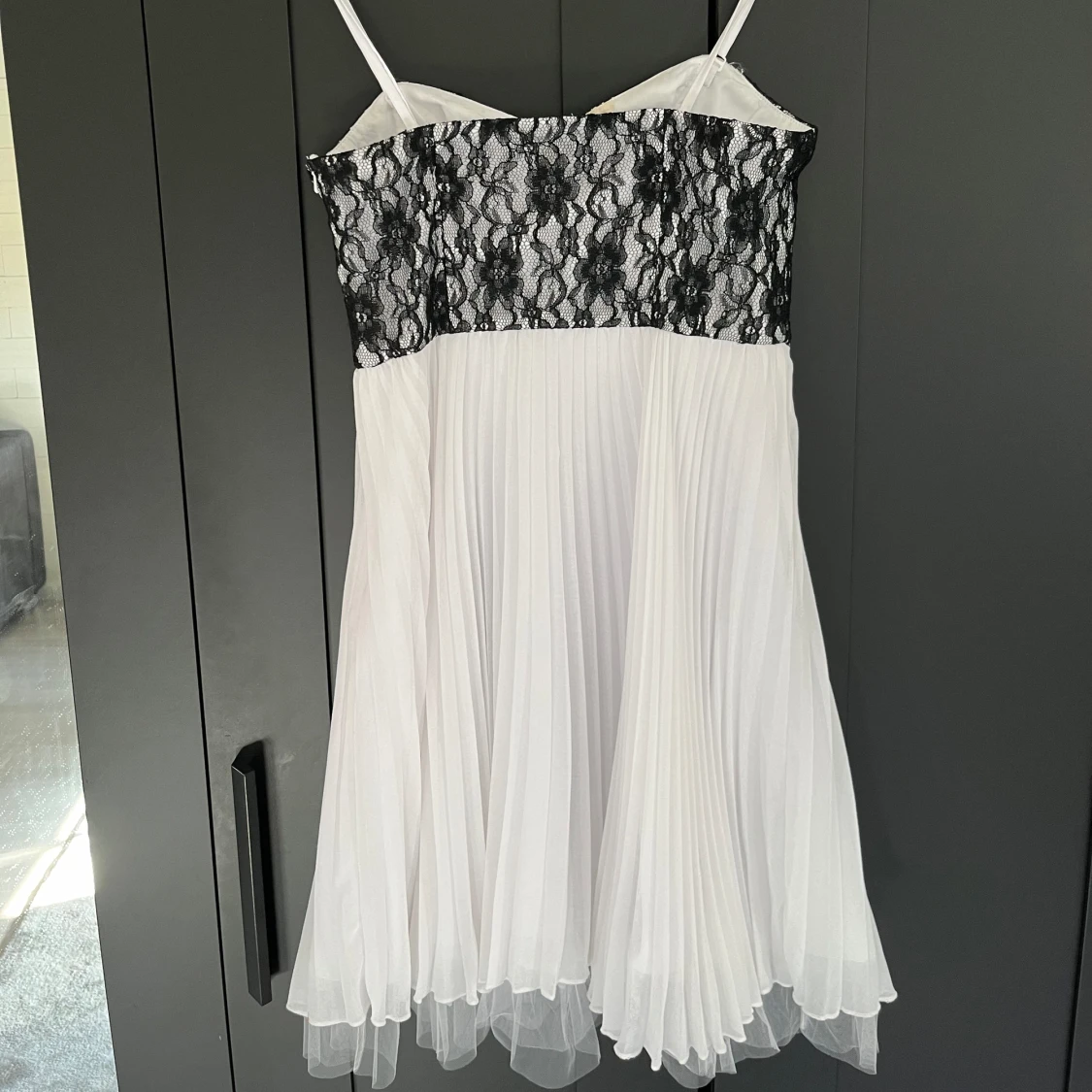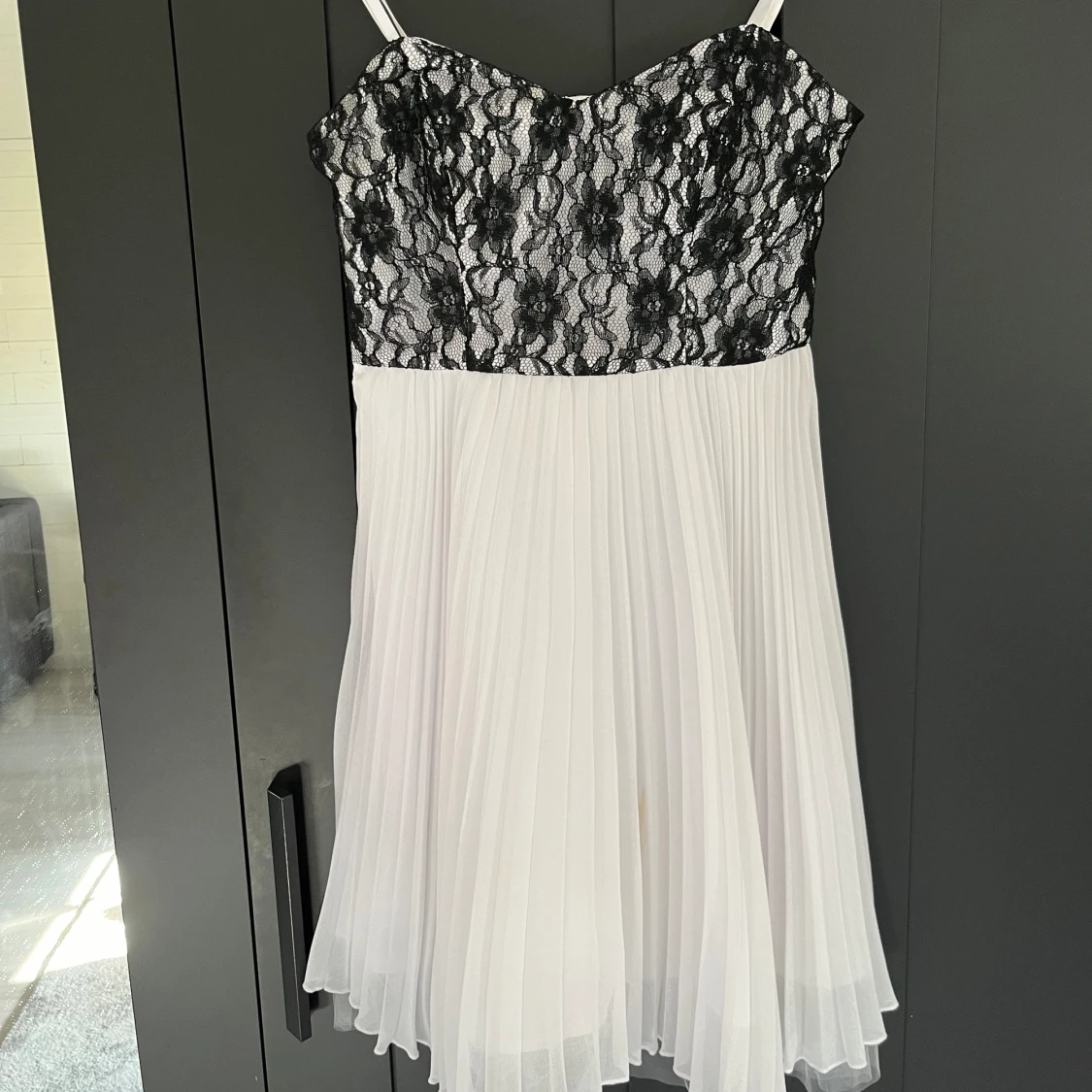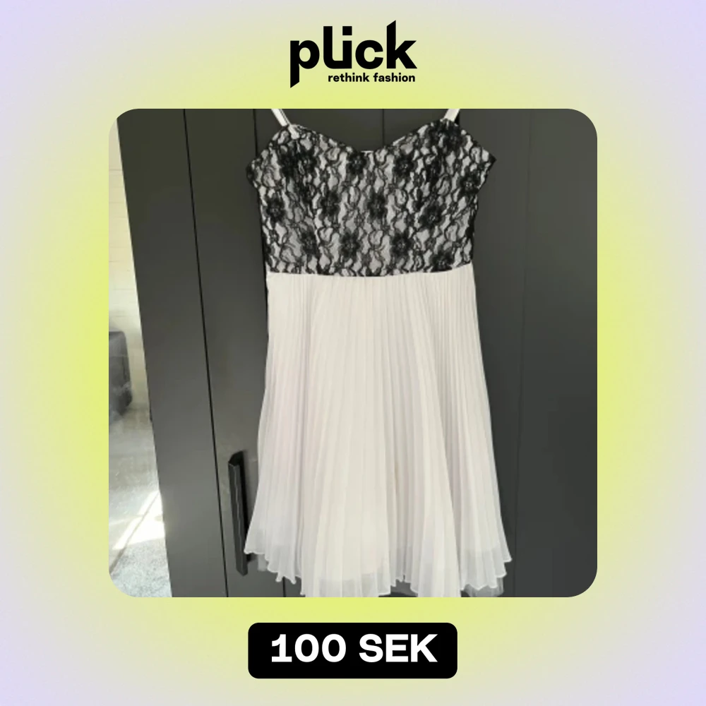 En vit klänning med svart spets. Har avtagbara axelband. Har två ganska små fläckar säljes därför billigt, annars väldigt bra skick. Storlek 34.
