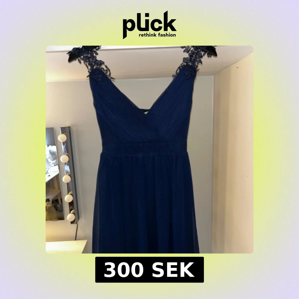 Marinblå kort klänning med fina spets detaljer på axelbanden. Oanvänd med lapp kvar