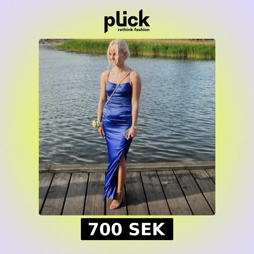 Säljer en snygg lång blå klänning i satinliknande material med smala axelband och öppen rygg med snörning. Klänningen har en slits framtill och figurnära passform, perfekt för bal eller fest. Stilren och elegant look! Använd 1 gång , Storlek xs