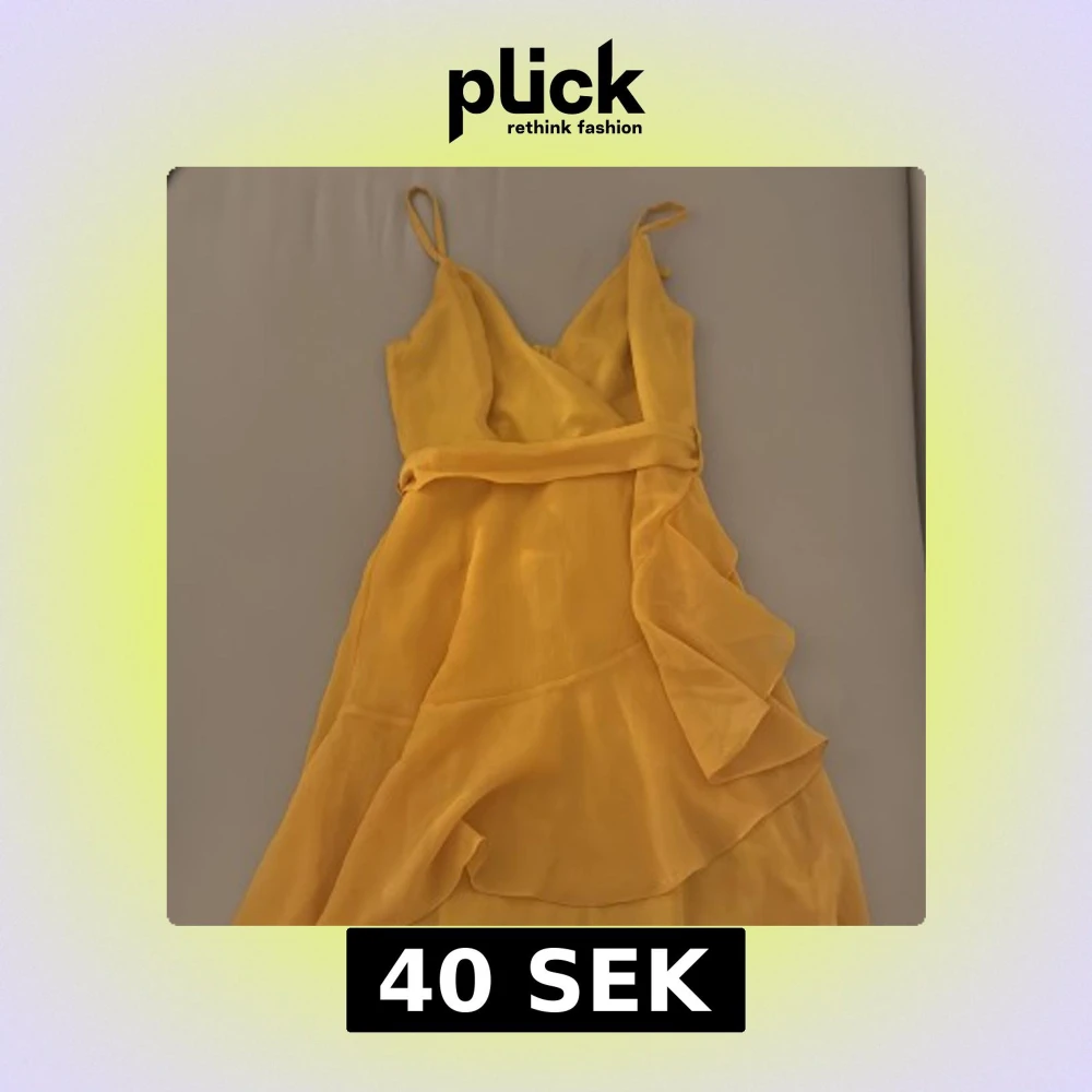 Superfin gul kortklänning med tunna axelband och omlottliv. Klänningen har volangdetaljer och ett skönt, lätt tyg som ger en flowig känsla. Perfekt för varma dagar när du vill sticka ut med en färgglad look.