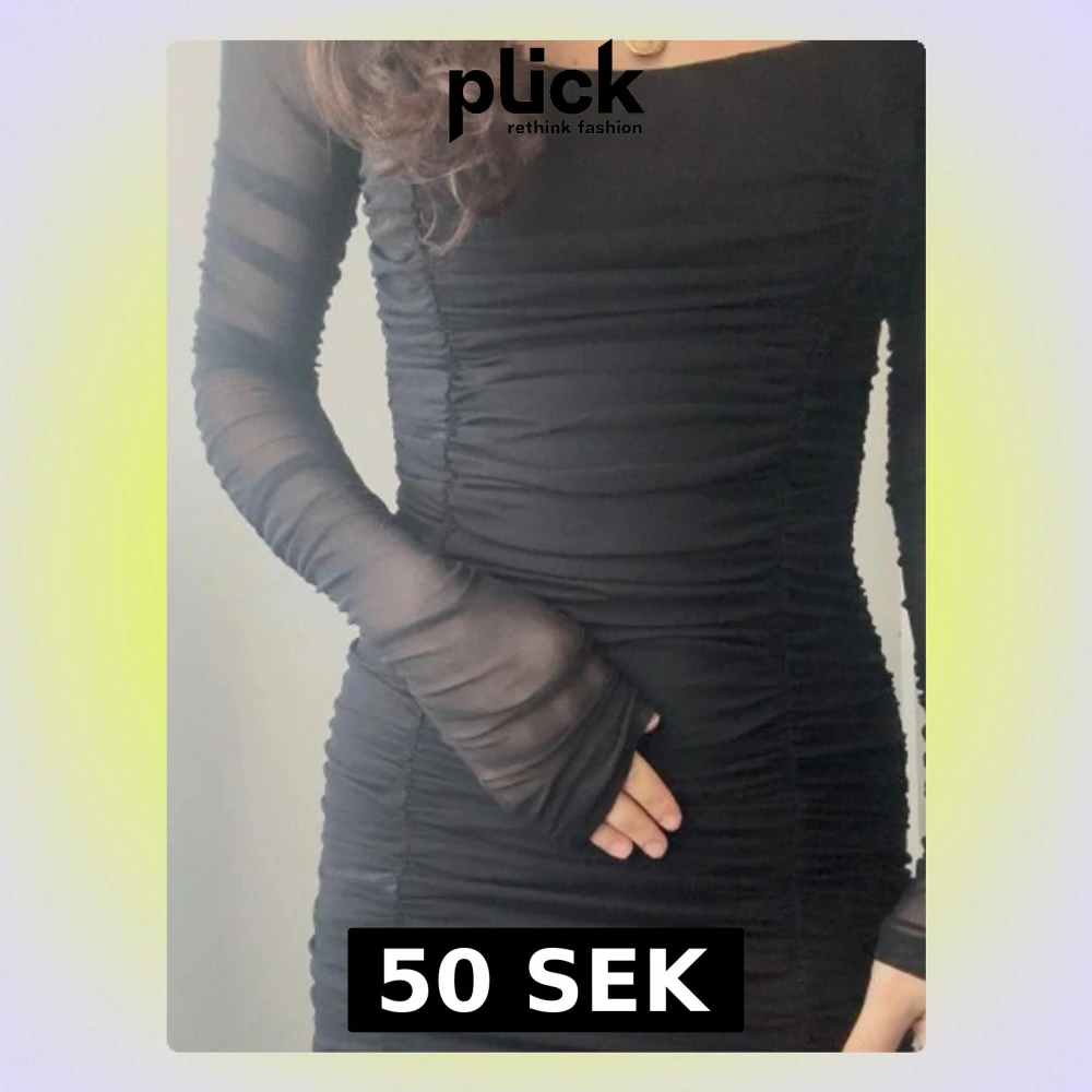 Säljer en svart långklänning med transparenta meshärmar och snygg rynkad design längs hela klänningen. Klänningen har en figurnära passform och lång ärm, vilket ger en cool och modern look. Perfekt för dig som gillar stilrena och trendiga plagg.