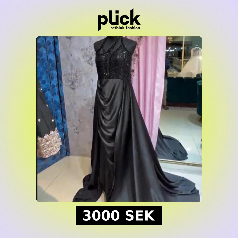 Elegant svart långklänning med glittrig överdel och halterneck-design. Klänningen har en vacker drapering och är perfekt för festliga tillfällen. Den skimrande ytan ger en lyxig känsla.