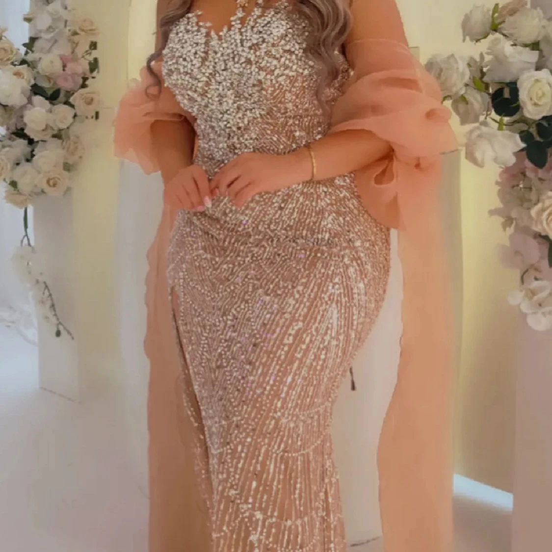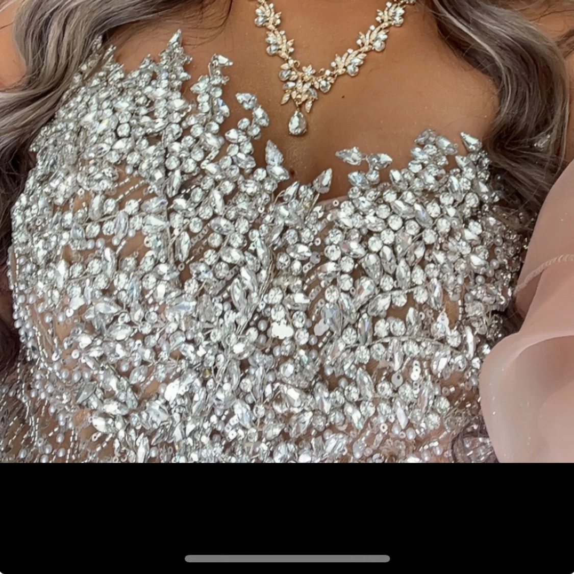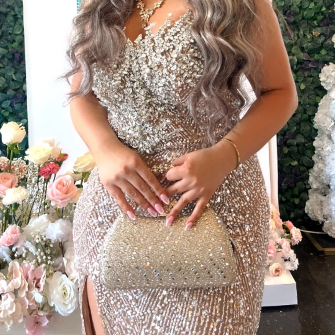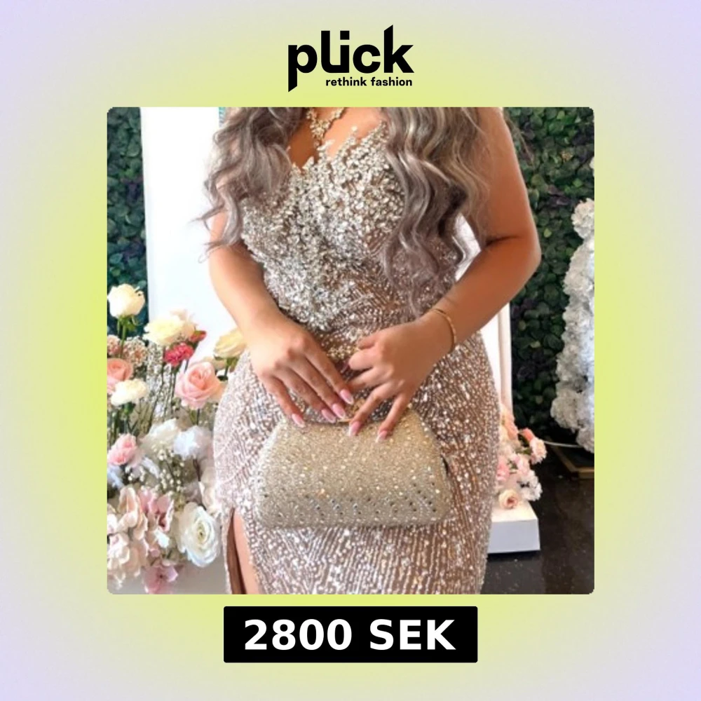 Säljer en magisk champagnefärgad långklänning med glittriga paljetter och pärlor över hela klänningen. Den har en v-ringad urringning, slits på sidan och är figurnära med snygg passform. Perfekt för bal eller fest, med exklusiv känsla och detaljer som verkligen sticker ut. Snören bak. Priset kan diskuteras