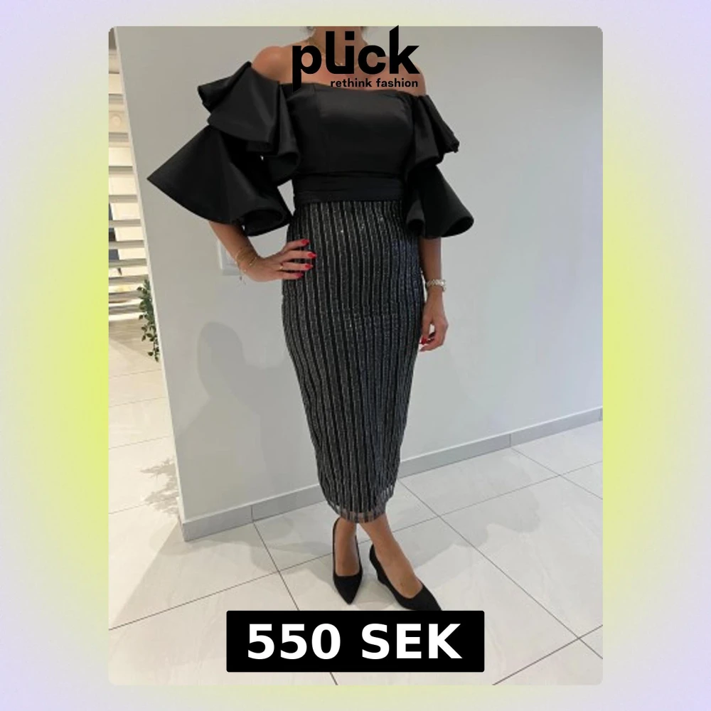 Supersnygg svart offshoulder klänning med stora volangärmar och figurnära passform. Kjolen är glittrig med vertikala silverränder och slits bak. Klänningen har dragkedja i ryggen och är perfekt för dig som vill sticka ut med en elegant och trendig look.