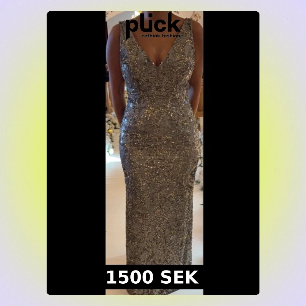Säljer en maxad lång confetti-glittrig klänning i silver + guldtoner. Djup v-ringning fram och öppen ry simmarvibe bak. Figurnära passform och skimrande paljetter över hela klänningen. Perfekt för dig som vill sticka ut på bal eller fest.