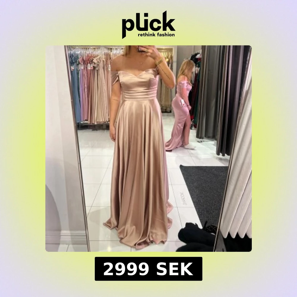 Elegant champagnefärgad långklänning i satin med offshoulder-design. Perfekt till Bal eller andra tillställningar. Prislappen kvar och i perfekt skick. Klänningen är ifrån dress room Linné. Pris kan diskuteras!