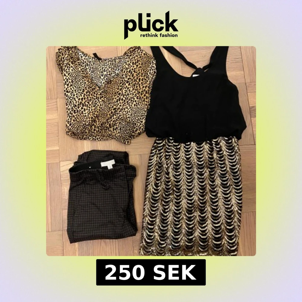 Klädpaket i stl. 34-36! Innehåll: Trendig leopardmönstrad omlottblus med långa ärmar och volangdetaljer. Bruna, rutiga kostymbyxor. Läcker svart/guldig klänning!