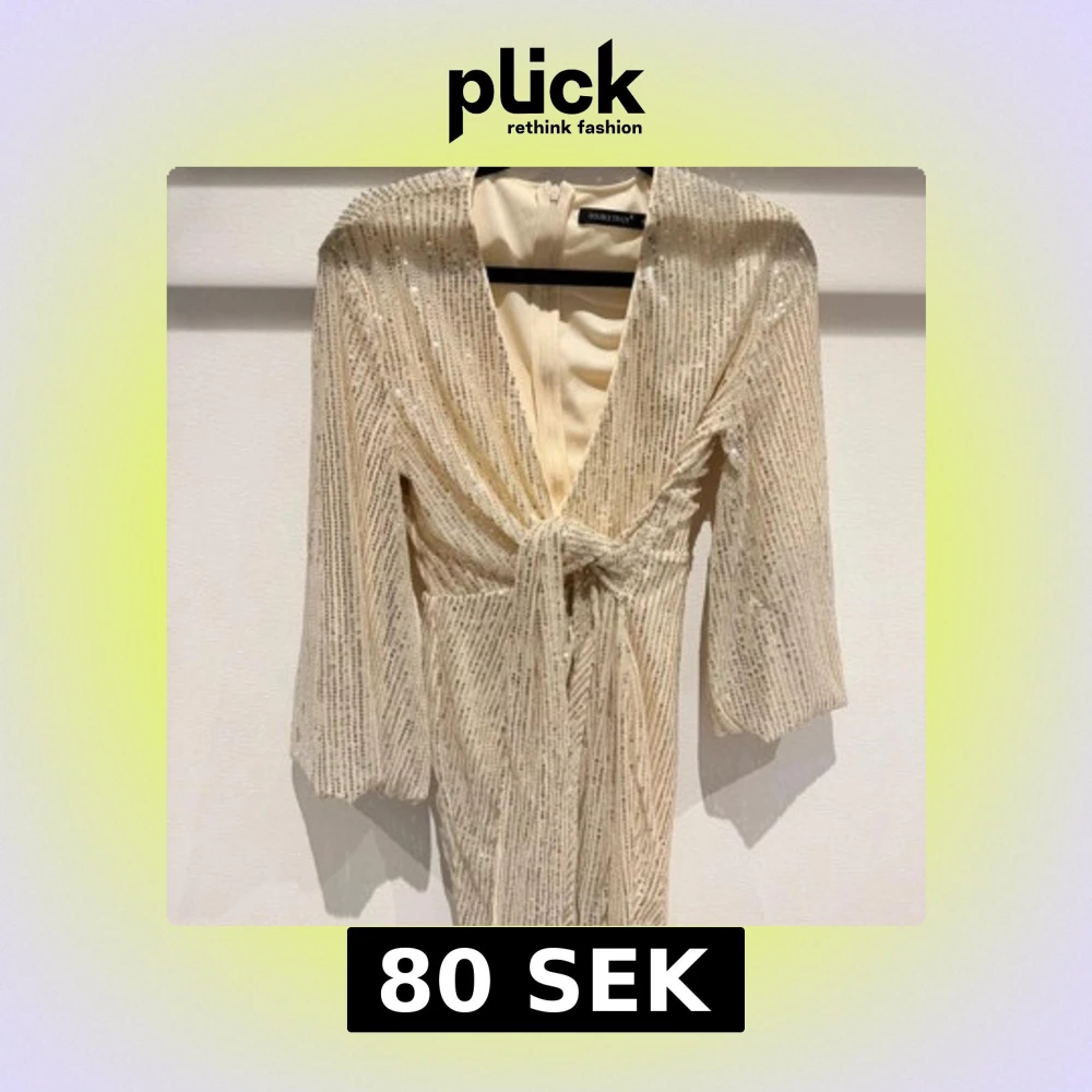 Snygg glittrig klänning i champagnefärg med v-ringad omlottfront, knyt i midjan och långa ärmar. Klänningen har ett festligt paljettmönster och är perfekt för att sticka ut. (Helt ny aldrig använd!)