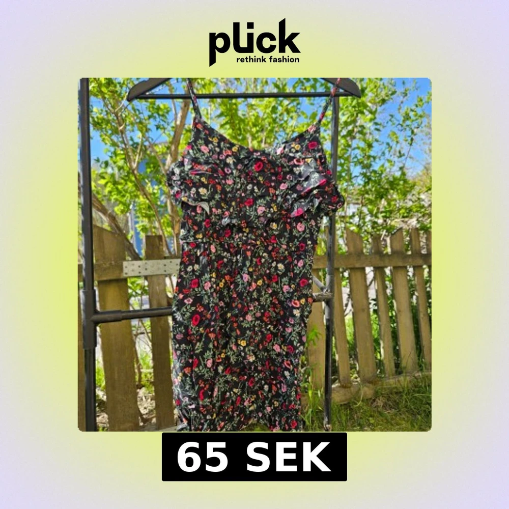 Säljer en svart kortklänning med färgglatt blommönster och smala axelband. Klänningen har en figurnära passform och är perfekt för varma dagar. Lätt och luftig känsla, passar dig som gillar romantisk stil.
