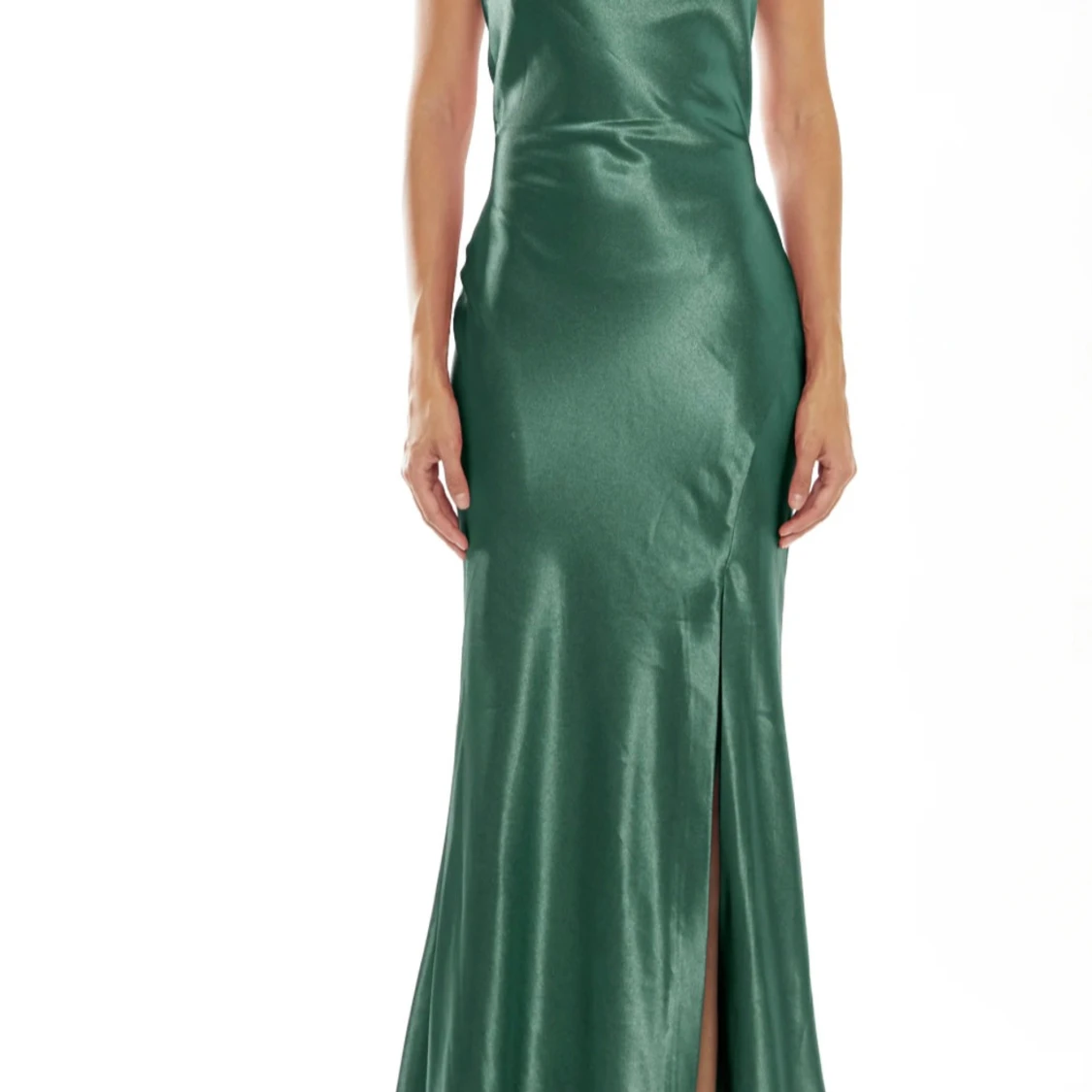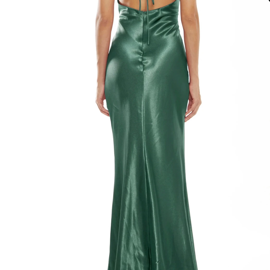 Mörkgrön långklänning i glansigt satinliknande material med smala axelband och snygg snörning i ryggen. Klänningen har en slits framtill som ger en extra touch. Perfekt för dig som vill sticka ut med en elegant och stilren look.