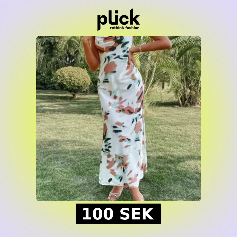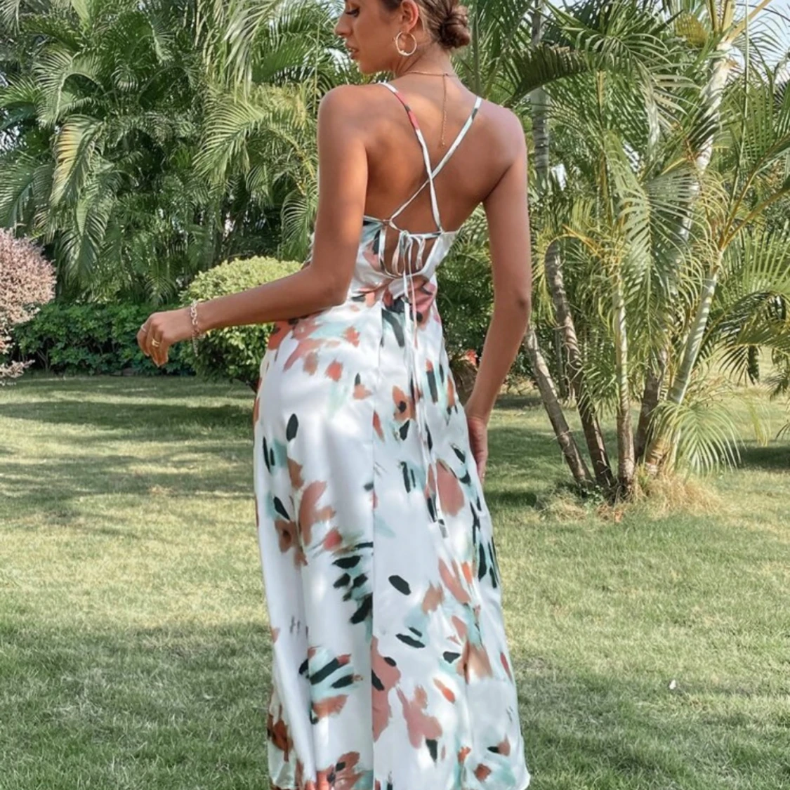 Säljer en vit långklänning med blommigt mönster i rosa, grönt och svart. Klänningen har smala axelband som korsas i ryggen och en öppen rygg med snörning. Materialet är glansigt och känns lyxigt, perfekt för varma dagar. Snygg passform och flowy känsla.