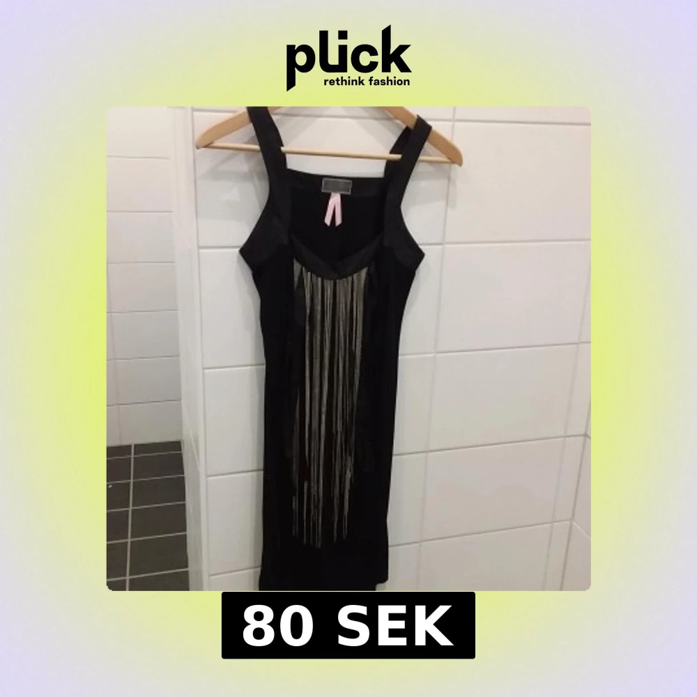 Elegant svart klänning med breda axelband och dekorativa fransar framtill. Perfekt för en stilfull kväll.