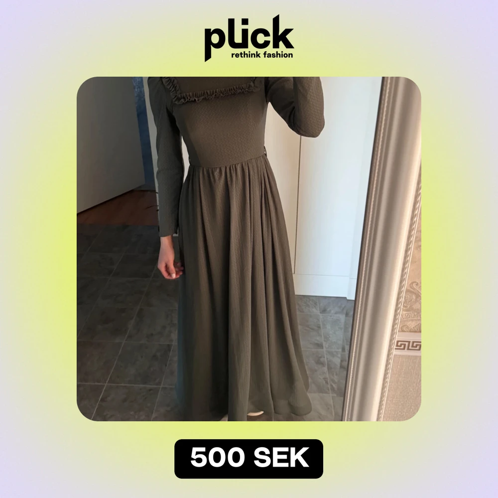Säljer en elegant mörkgrön långklänning med fina volangdetaljer vid bröstet. Klänningen har långa ärmar och en vacker, flytande kjol som ger en klassisk look. Är 166