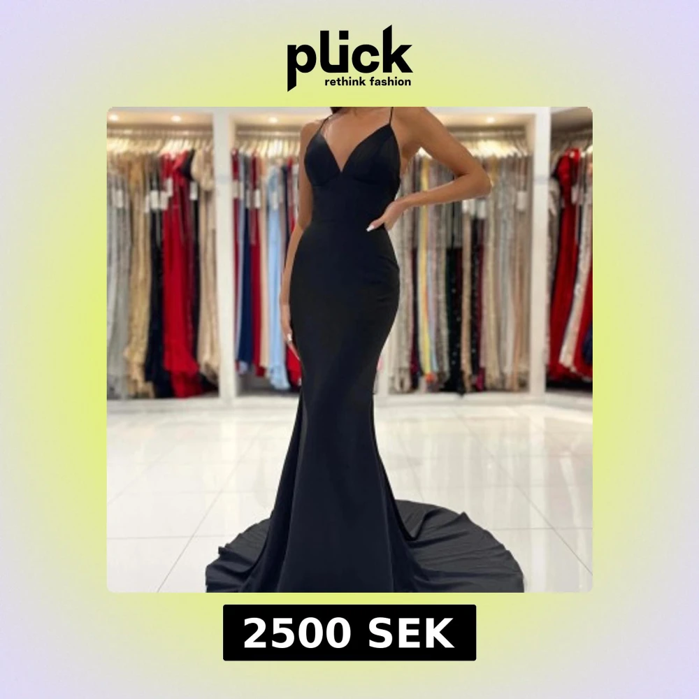 En elegant, svart lång balkklänning med smala axelband och djup v-ringning. Klänningen har en figurnära passform och ett vackert släp. Perfekt för bal eller liknande festlighet. Orginalpris vid köp var ca 3800 kr