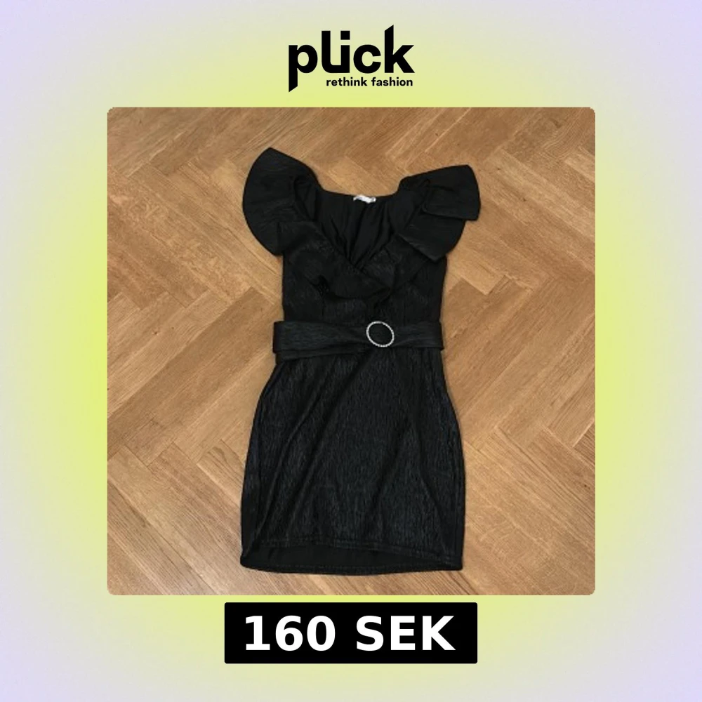 Supersnygg svart kort klänning med markerad midja och bälte med glittrande spänne. Klänningen har volangdetaljer vid axlarna och en v-ringad omlottfront. Perfekt för dig som vill sticka ut med en elegant och trendig look.