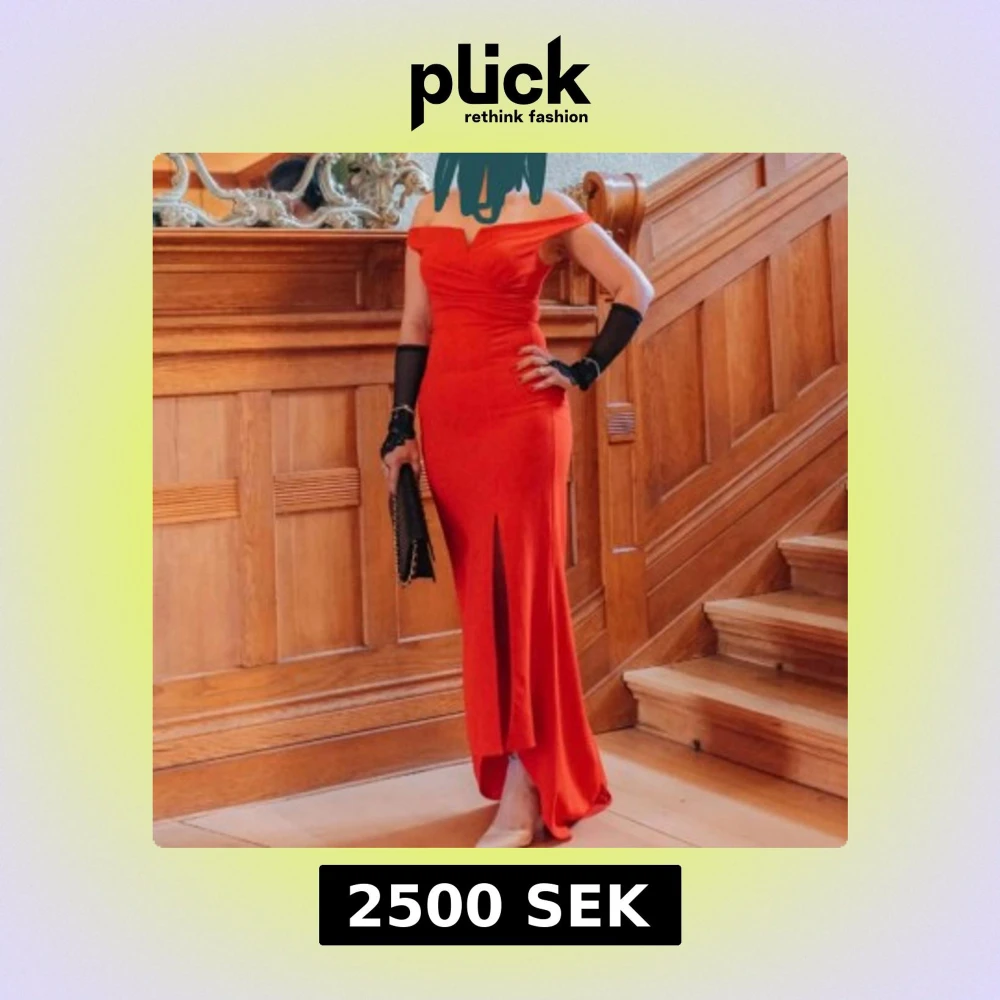 Snygg röd långklänning med omlott-detalj över bysten och v-ringad hals. Klänningen har en slits framtill och axelbandslös design som ger en elegant look. Materialet är mjukt och följsamt, perfekt för bal eller fest. Dragkedja i ryggen för enkel påklädning. Den är töjbar, men även insydd. Så man kan sprätta sömen så att det passar någon annan.
